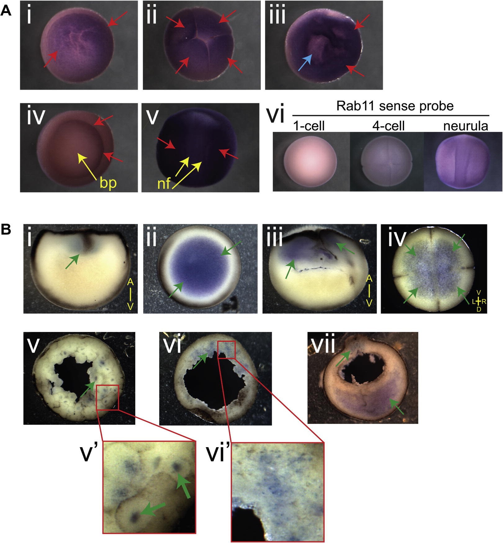 Fig. 4 Rab11 mRNA and protein expression during development. (A) Whole mount in situ hybridization was performed for Rab11 on albino embryos at 1-cell (i), 4-cell (ii), blastula (iii), gastrula (iv) and neurula stages (v). At all stages, a diffuse signal (purple) was visible throughout the embryo with the strongest signal localized in the animal pole. Sense probes show little signal at all stages examined (vi, data not shown). Red arrows indicate signal, blue arrow on blastula stage embryo indicates areas with lower signal due to contraction of the hollowembryo during fixation; this is an artifact. bp = blastopore, nf = neural folds. (B) Immunohistochemical analysis was performed for Rab11 protein on 100 lm sections collected from embryos at 1 cell (i and ii), 4-cell (iii and iv), blastula (v), gastrula (vi) and neurula (vii). At 1-cell, Rab11 protein is localized to the animal hemisphere, with the strongest expression near the cleavage furrow (i) and no other visible biases (ii). At 4-cell Rab11 remains localized to the animal hemisphere (iii) and is relatively symmetrical along the LR and dorsalentral axes (iv). A small portion of embryos showed slight asymmetries along the LR axis at 4-cell, but these were not consistently biased (data not shown). Rab11 is highly localized within cells of blastula (v) and gastrula stage embryos (vi). This strong expression likely corresponds to the perinuclear region of the cell (see v', vi'). In neurula stages, Rab11 is visible in the neural folds and notochord, and a diffuse signal is also visible throughout the endoderm (vii). Green arrows indicate positive signal. |