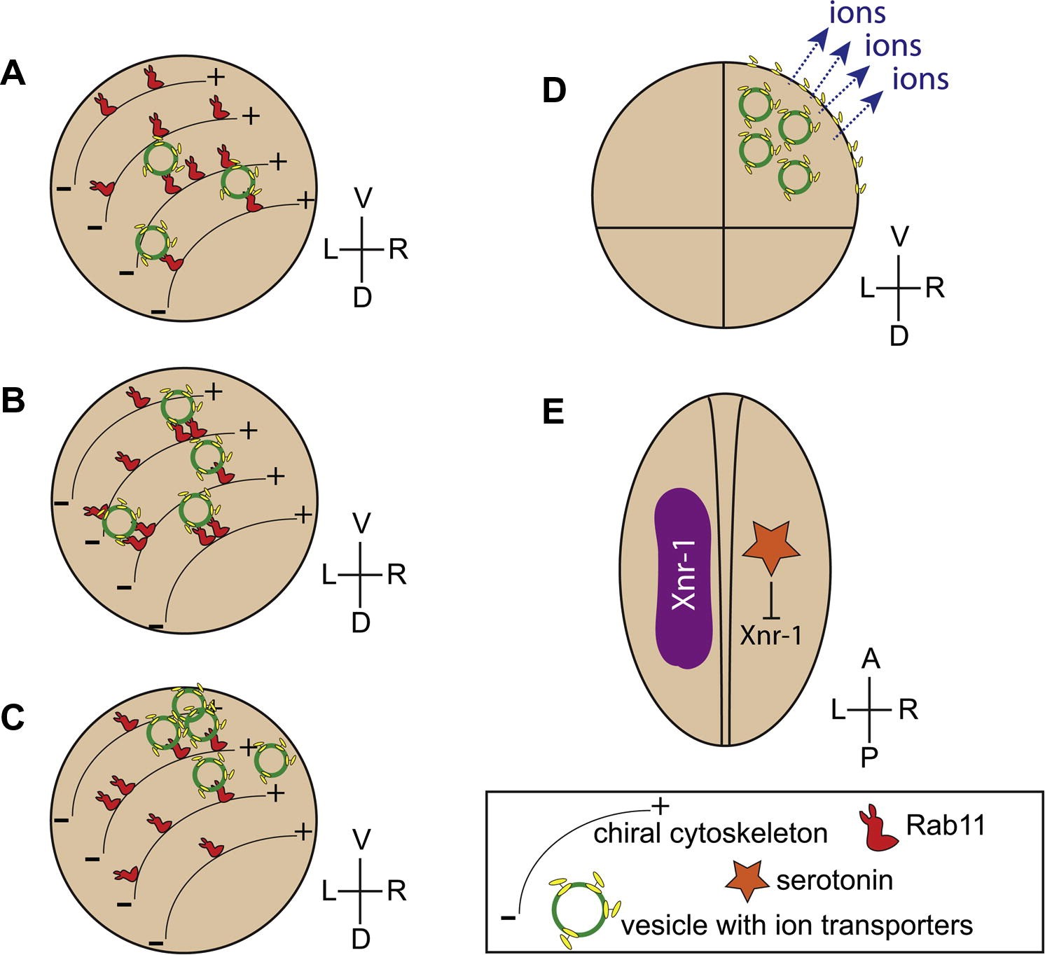 Fig. 7 Experimental results support an assembly-line model of Rab11-mediated vesicular traffic in the ion flux model of LR asymmetry. Schematic representation of the assembly line model of Rab11-mediated transport of vesicles in the early embryo. (A) Rab11 associates with ion transporter-containing vesicles throughout the embryo. (B) Rab11 molecules attached to vesicles move toward the + end of the cytoskeletal structure for a short distance, and then dissociate from the vesicles. Other Rab11 molecules then attach to the vesicles in the exchanges shown. (C) Vesicles containing ion transporters accumulate in the right ventral cell, but Rab11 remains distributed evenly, as indicated by the relatively symmetric expression of endogenous Rab11 mRNA and protein (Fig. 4). (D) The biased localization of ion transporters establishes the asymmetric bioelectrical properties that have been reported previously in early Xenopus embryos. The pumping of positive ions out of the right ventral cell causes it to be relatively more negative than other blastomeres. (E) Membrane voltage and pH gradients drive the asymmetric localization of serotonin, a positively charged molecule, by the 32-cell stage (not shown). Serotonin localized to the right side of the embryo actively suppresses Xnr-1 expression on the that side at stage 22. |