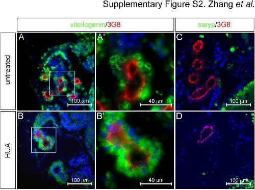 Supplementary Fig. S2. Inhibiting of proliferation causes yolk platelet accumulation. (A�D) Immunofluorescence staining of proximal tubules using 3G8 (red), anti-vitellogenin or anti-seryp antibodies (green) comparing untreated and Hydroxyurea/Aphidicolin (HUA) treated embryos at stage 40. (A′ and B′) are close-ups of the proximal tubules indicated by white boxes in (A and B); nuclei were counterstained with DAPI (blue).