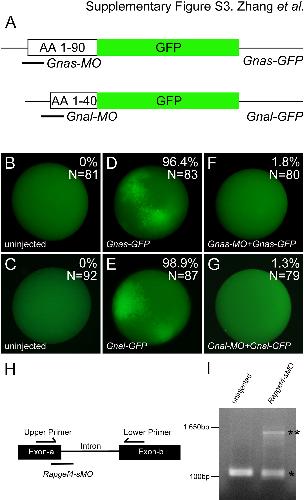 Supplementary Fig. S3. Efficacy of the antisense morpholino oligomers. (A) Schematic of the GFP fusion proteins containing the 5′UTR and part of the coding sequence of Gnas and Gnal. The position of the Gnas-MO and Gnal-MO are indicated. (B�G) Xenopus embryos were injected animally with the Gnas-MO and Gnal-MO at the 2�4 cells stage followed by two diametral injections of synthetic mRNA encoding either Gnas- or Gnal-GFP at the 8-cell stage, while control embryos were only injected with the Gnas- or Gnal-GFP mRNA. Embryos were analyzed at stage 10.5 by florescence microscopy. Representative images are shown and the percentage of GFP-positive embryos is indicated in the upper right corner of each panel. (H) Schematic of the exonic sequence targeted by Rapgef4-sMO. Positions of the PCR primers used to test the splicing efficacy are indicated. (I) Representative image of the PCR reaction using mRNA from embryos injected with Rapgef4-sMO or uninjected controls. Position of the correctly spliced and the unspliced mRNA are indicated by one or two asterisks, respectively.