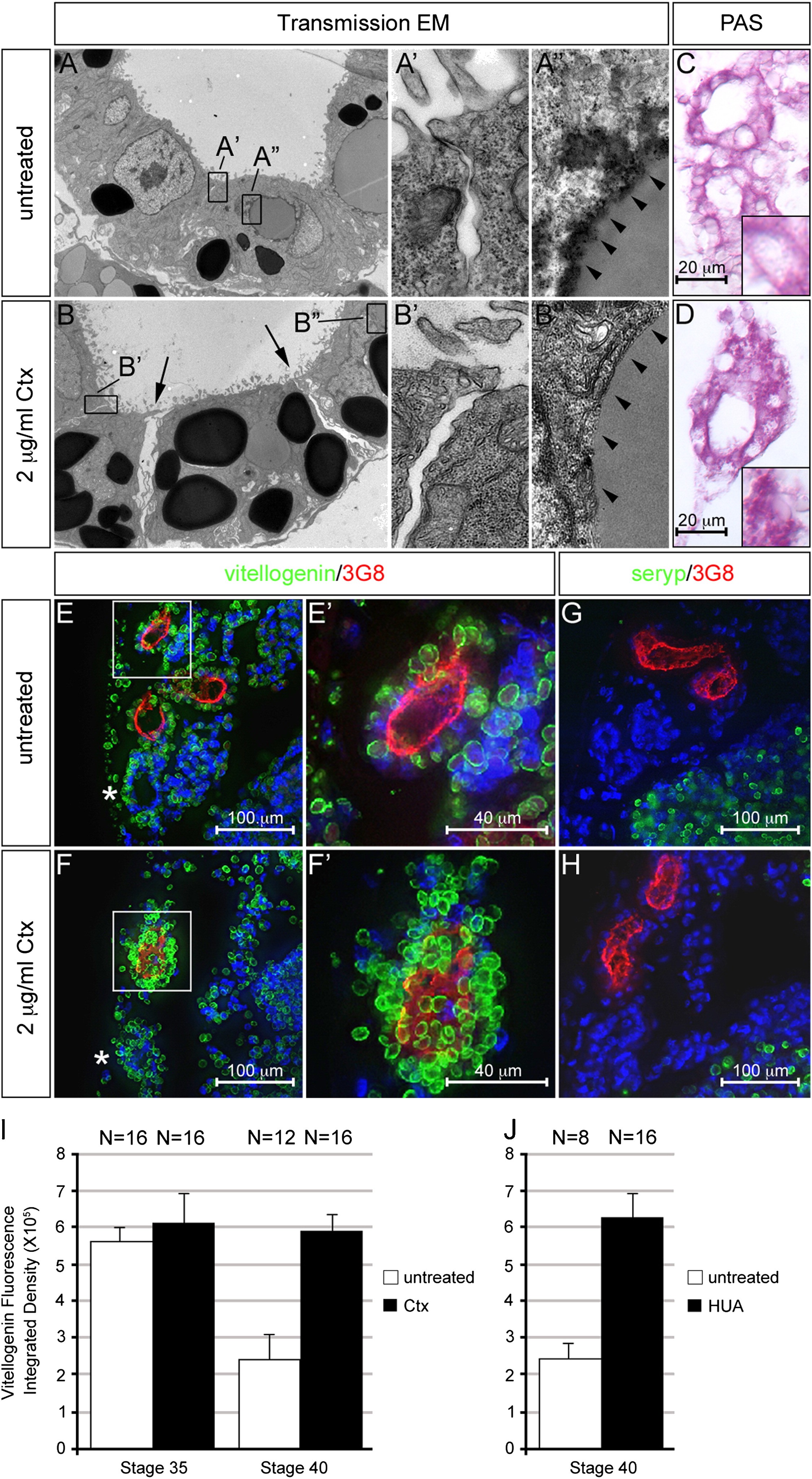 Fig. 2. Interfering with proximal tubular growth caused a defect in yolk platelet degradation. (A to B″) Xenopus embryos were treated with 2 μg/ml Ctx at stage 29/30 and analyzed at stage 42 using transmission electron microscopy at a 2650-fold (A and B) or 31,000-fold magnification (A′, A″, B′ and B″). Position of the insets is indicated by the black boxes in (A and B). Arrows indicate the gaps between the proximal tubular cells upon Ctx treatment, arrowheads point towards the membrane layer surrounding the degrading yolk platelets. (C and D) PAS staining to visualize protein-rich granules in the proximal tubules. Inset shows close-up of a single cell. (E and H) Immunofluorescence staining of proximal tubules using 3G8 (red), anti-vitellogenin or anti-seryp antibodies (green). (E′ and F′) are close-ups of the proximal tubules indicated by white boxes in (E and F); the asterisks indicate the distal tubules; nuclei were counterstained with DAPI (blue). (I and J) Quantification of anti-vitellogenin staining for untreated and Ctx treated embryos at stage 35 and 40 (I) as well as untreated and treated with Hydroxyurea/Aphidicolin (HUA) at stage 40 (J).