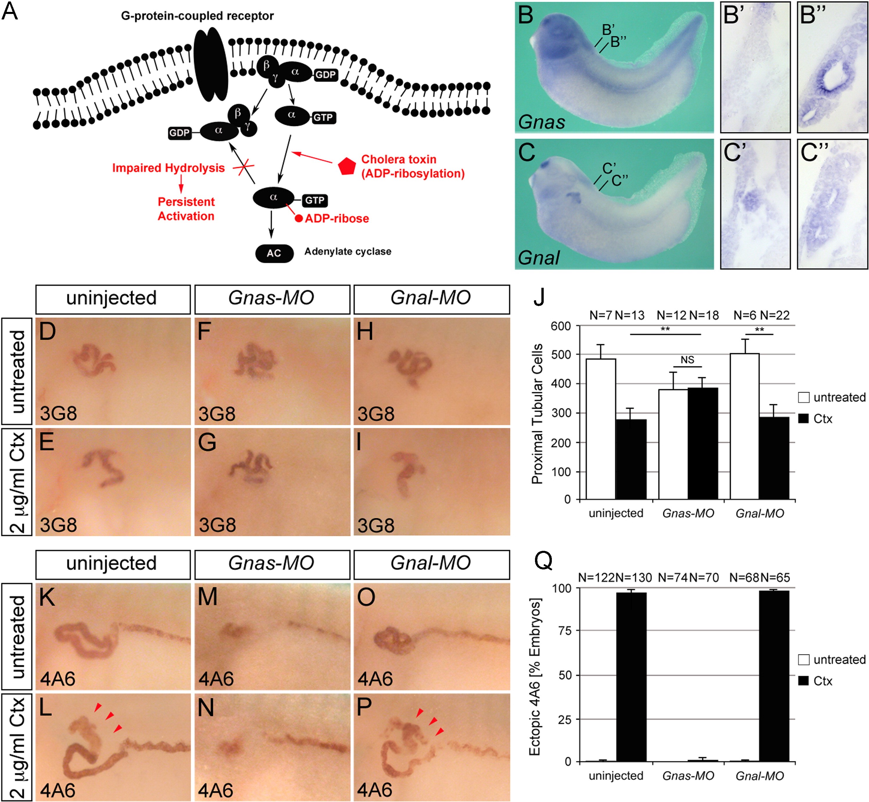 Fig. 3. Gnas is the target of cholera toxin action. (A) Schematic of signaling via the Gαs G-protein family. The activity of Ctx is indicated in red. (B and C‴) In situ hybridization of Xenopus embryos at stage 35 for Gnas and Gnal mRNA by whole mount or paraplast sections thereof. The position of the transverse sections is indicated in (B and C). (D�Q) Whole mount immunostaining with the 3G8 (D�I) and 4A6 antibody (K�P) in control embryos or embryos injected with the Gnas-MO or the Gnal-MO in the presence or absence of 2 μg/ml Ctx at stage 40. Ectopic 4A6 staining is indicated by red arrowheads. Quantification of proximal tubular cell numbers at stage 42 (J) and ectopic 4A6 staining at stage 40 (Q) summarizing three independent experiments. Data were analyzed by Student's t-test with indicating a p value of <0.01.