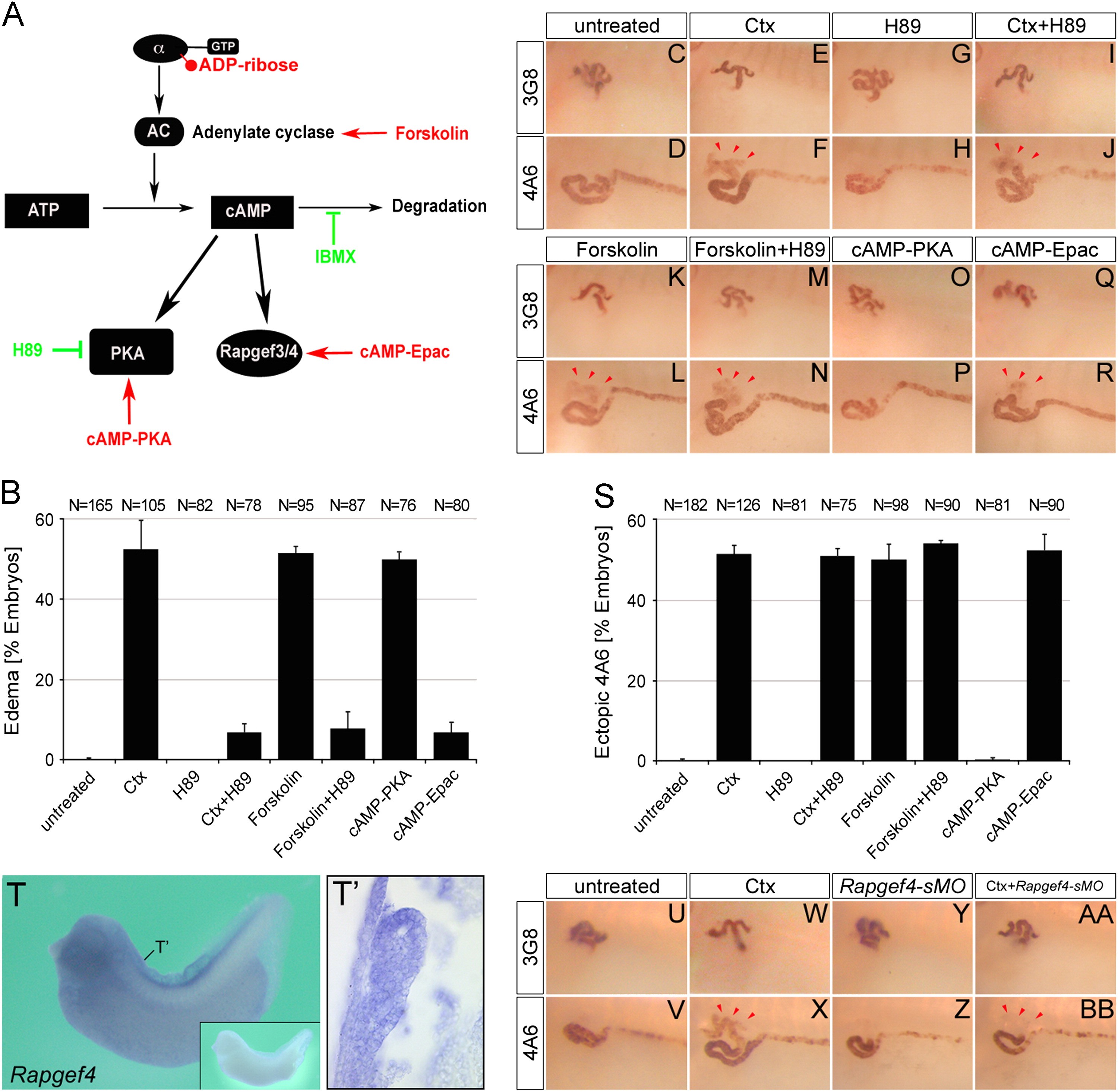 Fig. 4. Activation of Rapgef4 is responsible for the proximal tubular phenotypes. (A) Schematic diagram depicting how Gnas signals to PKA and Rapgef3/4. Pathway agonists and antagonists are indicated in red or green, respectively. (B�S) Xenopus embryos were treated with multiple compounds modulating Gnas signaling and analyzed for edema formation at stage 42 (B) and 3G8/4A6 staining (C�S). Red arrowheads indicate ectopic 4A6 staining. Note that all the agonists were used at an ED50 concentration to provide a more sensitive experimental setup. (T and T′) In situ hybridization of Xenopus embryos at stage 35 for Rapgef4 mRNA by whole mount or paraplast sections thereof. The position of the transverse section is indicated in (T). Close-up in (T) shows the sense control. (U�BB) Whole mount immunostaining with the 3G8 and 4A6 antibody of control embryos or embryos injected with the Rapgef4-sMO in the presence or absence of 2 μg/ml Ctx at stage 40. Ectopic 4A6 staining is indicated by red arrowheads in (X) and (BB).