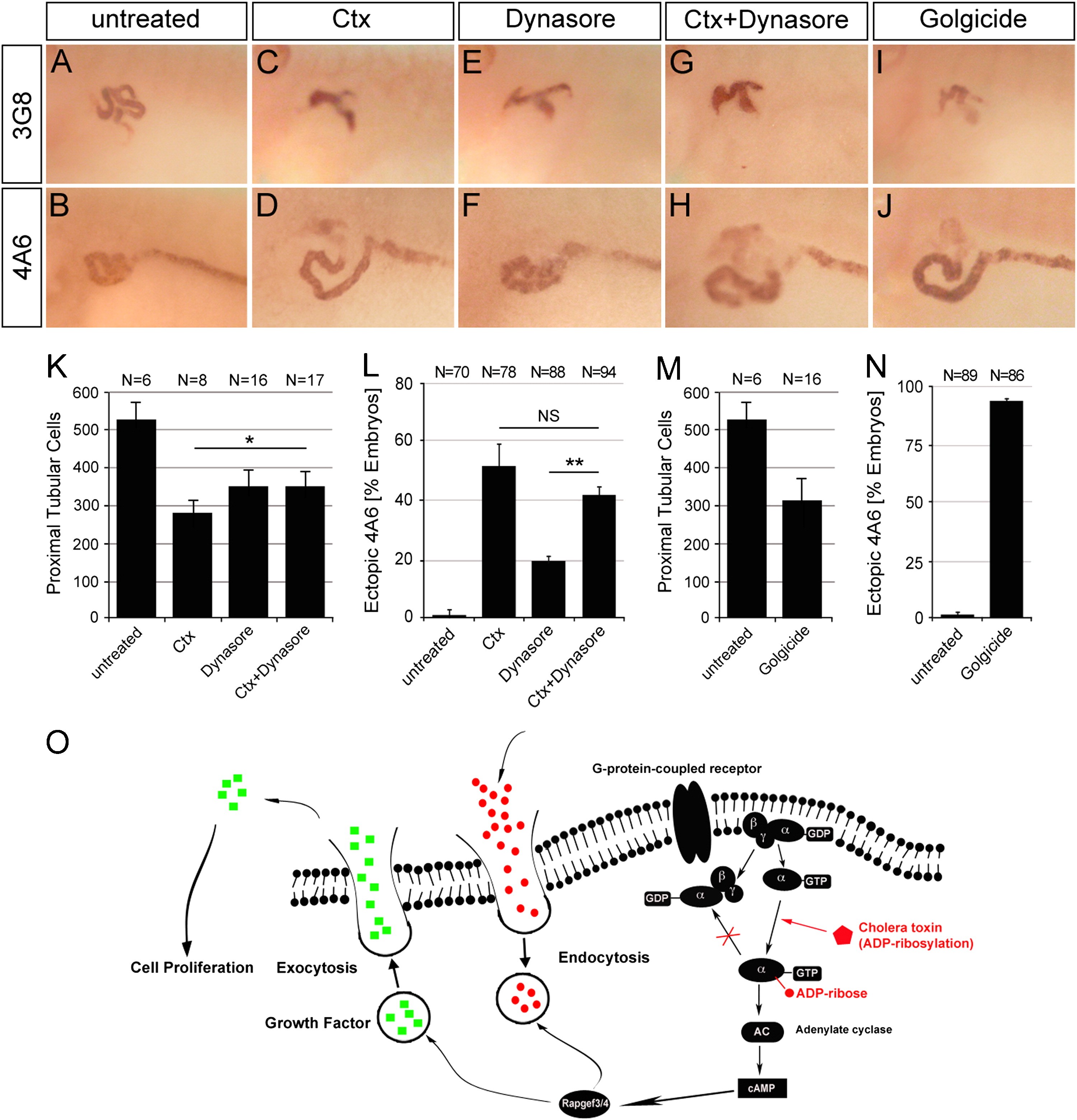 Fig. 6. Imbalance of endo- and exocytosis by Ctx causes proximal tubular defects. (A�J) Whole mount immunostaining with the 3G8 and 4A6 antibody of control embryos or embryos treated with 50 mM Dynasore in the presence or absence of 2 μg/ml Ctx or 50 μM Golgicide A at stage 40. (K�N) Bar diagrams quantifying proximal tubular cell numbers at stage 42 (K and M) and ectopic 4A6 staining at stage 40 (L and N) summarizing three independent experiments. Data were analyzed by Student's t-test with indicating a p value of <0.05 and a p value of <0.01. (O) Schematic diagram depicting the proposed mechanism of Ctx in Xenopus embryos (see text for details).