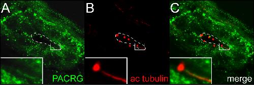 Additional file 2. Additional Figure 2 Localization of PACRG to primary cilia of the pronephric duct. Tadpoles at stage 37/38 were fixed and processed for immunohistochemistry with antibodies specific for PACRG (green) and acetylated tubulin (red). Specimens were sectioned on a vibratome (30μm) and viewed in the confocal laser scanning microscope. The lumen of the pronephric duct is outlined by a white dashed line. White rectangles indicate regions shown in higher magnification in the lower left corner. |