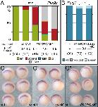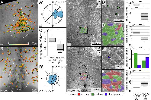 Figure 6. Absence of leftward flow and altered gastrocoel roof plate (GRP) morphology in PACRG morphants. (A,B) Loss of leftward flow in PACRG morphant GRPs. Gradient time trail (GTT) projection of directed bead trajectories (25 s, indicated in color bar). (A',B') Circular histograms of mean angles of trajectories. (C) Quality of flow, as depicted by the dimensionless number rho. (D,E) SEM analysis of wild-type (D) and PACRG morphant (E) dorsal explants. GRP area indicated by dashed line. Note the loss of posterior polarization of cilia in enlargements of characteristic cells in (D',E'), and the marked increase in non-ciliated cells (D'',E''). (F) Altered ciliation rates, mean cilia lengths, polarization of residual cilia and mean apical cell surface areas, as assessed in standardized central GRP areas of 86 μm2 each [21].