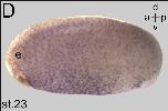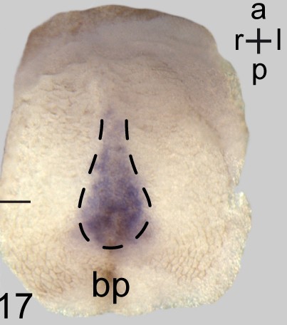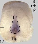 pacrg (PARK2 co-regulated) gene expression in Xenopus laevis embryo, assayed via in situ hybridization, NF stage 23, posterior view, dorsal up. |