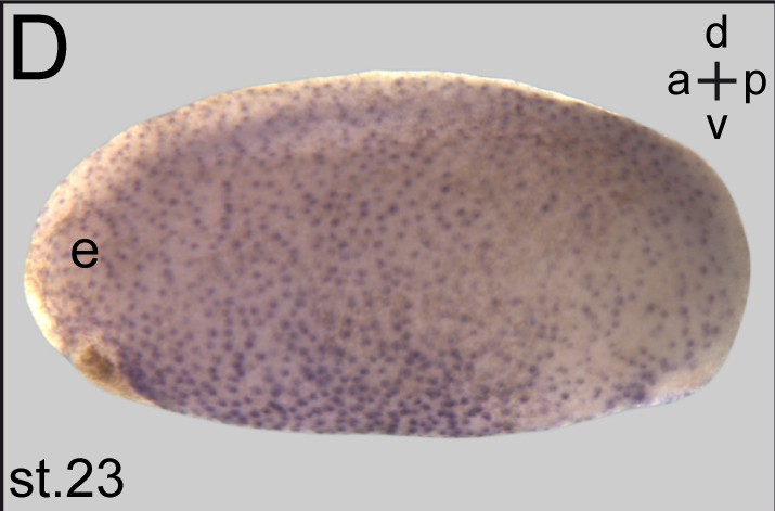 pacrg (PARK2 co-regulated) gene expression in Xenopus laevis embryo, assayed via in situ hybridization, NF stage 23, lateral view, anterior left, dorsal up. |