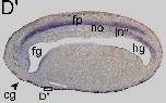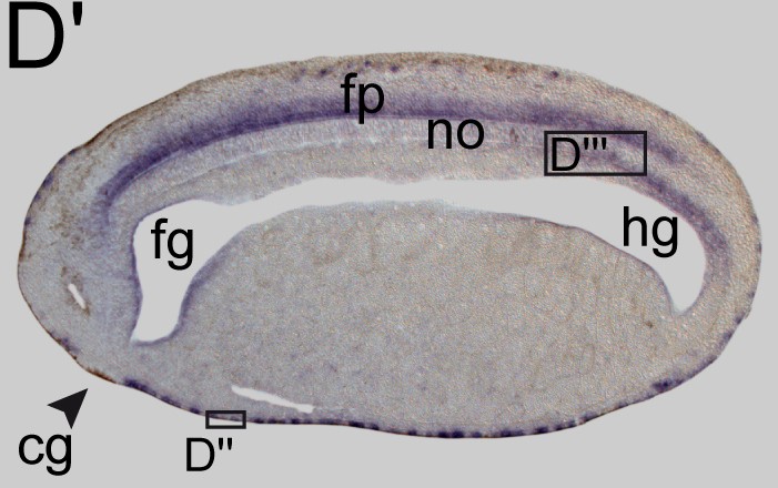 pacrg (PARK2 co-regulated) gene expression in Xenopus laevis embryo, assayed via in situ hybridization, NF stage 23, transverse section, anterior left, dorsal up.