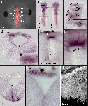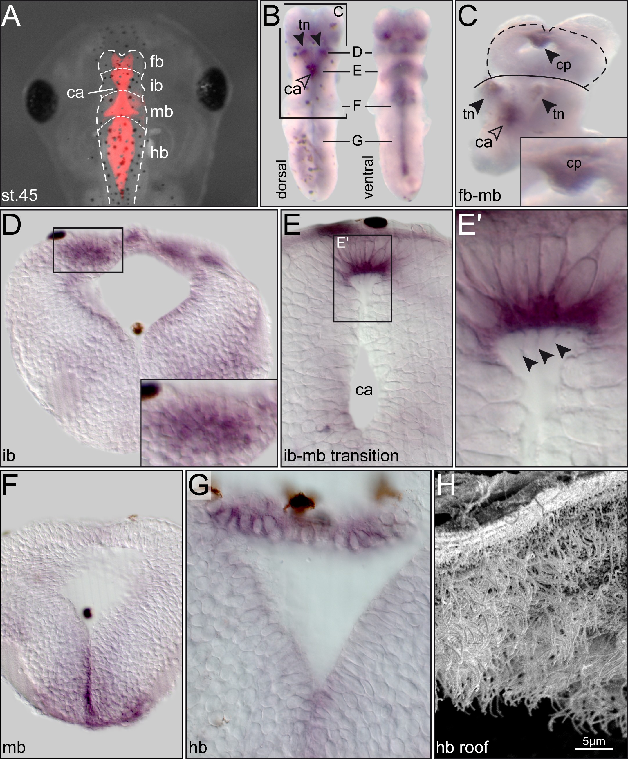 Figure 2. PACRG expression in the developing Xenopus brain. (A) Brain anatomy of the 3-day tadpole (stage 45), as highlighted by rhodamine dextran injection into the hindbrain ventricle. (B) Isolated brain following in situ hybridization with an antisense PACRG probe, shown in dorsal (left) and ventral (right) view. (C) Whole-mount of brain in which the hindbrain was removed and a dorsal cut was introduced between forebrain and interbrain to expose the choroid plexus (higher magnification shown in inset). (D-G) Transversal histological sections; levels indicated in (B), dorsal side up. (D) Staining in the thalamic nuclei. (E) Localized expression in roof of cerebral aqueduct (cilia highlighted by arrowheads in the enlargement shown in (E�)). (F) Expression in ventral midline of midbrain region. (G) Staining in roof of hindbrain. (H) Scanning electron micrograph, demonstrating multiciliated cells in roof of hindbrain. caâ=âcerebral aqueduct; cpâ=âchoroid plexus; fbâ=âforebrain; hbâ=âhindbrain; ibâ=âinterbrain; mbâ=âmidbrain; tnâ=âthalamic nucleus. Note that dark brown spots in whole-mount brain specimens (B) and sections (D-G) represent melanocytes.