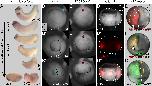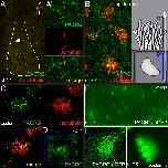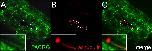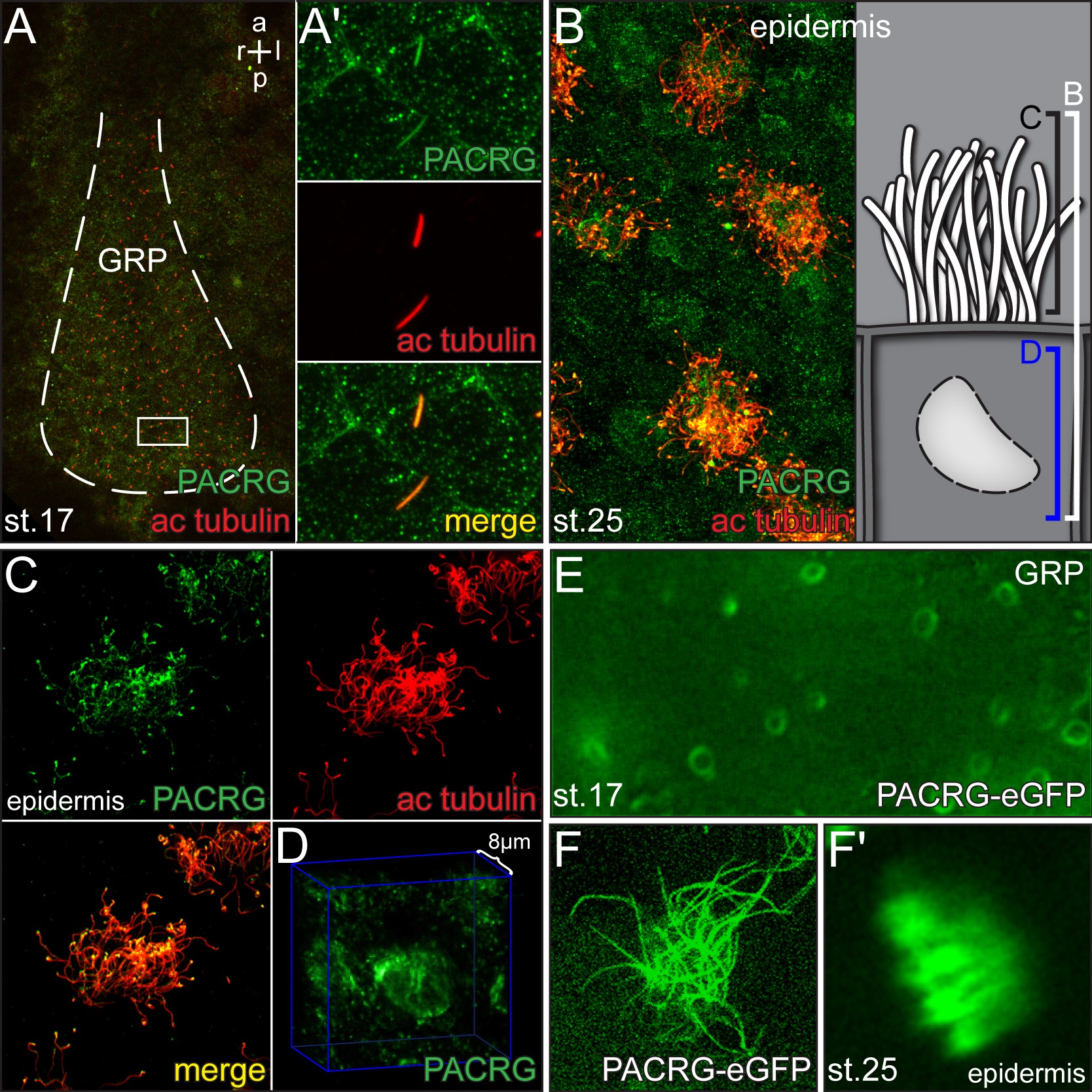 Figure 4. PACRG protein localization. (A-D) Immunohistochemistry. PACRG shown in green and acetylated tubulin in red. (A) Ventral view of gastrocoel roof plate (GRP) (dashed white line) at stage 17. (A�) Enlargement of GRP cilia. (B) Epidermis. Overview and schematic depiction of multiciliated epidermal cell. (C,D) Enlargements of cilia (C) and cytoplasmic PACRG staining (D). Note that within the cell PACRG localizes to vesicle-like structures and the perinuclear region. (E,F) Expression of a PACRG-enhanced green fluorescent protein (PACRG-eGFP) fusion protein. (E) Maximum intensity projection of timelapse movie of stage 17 GRP cilia, demonstrating elliptic shape of ciliary beating. (F) Squash preparation and (F�) maximum intensity projection of timelapse movie of stage 25 multiciliated skin cell. aâ=âanterior; acâ=âacetylated; lâ=âleft; pâ=âposterior; râ=âright.