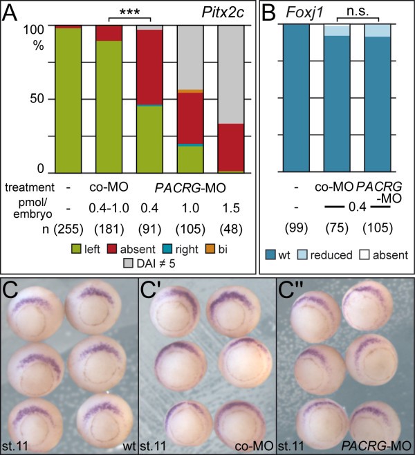 Figure 5. Impaired laterality in PACRG morphants in the absence of superficial mesoderm (SM) defects. (A)Pitx2c gene expression in the lateral plate mesoderm (LPM). Note that the morpholino oligonucleotide (MO) dose chosen (0.4 pmol/embryo) did not affect dorsoanterior development. (B,C) Unaltered Foxj1 expression levels in the SM of morphants. Assessment of expression levels was as described previously [36]. Embryos in (C) are shown in vegetal view, dorsal side up. Numbers in brackets represent number of analyzed specimens. ***â=âvery highly significant (P <0.001); n.s., not significant (Pâ=â0.891).