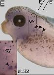 pacrg (PARK2 co-regulated) gene expression in Xenopus laevis embryo, assayed via in situ hybridization, NF stage 32, lateral view, head and trunk region only, anterior left, dorsal up. |