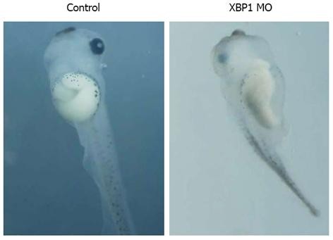RESULTS: In the whole-mount in situ hybridization analysis, xenopus IRE1α and IRE1β showed quite different expression pattern during tadpole stage. The relatively higher expression of IRE1α was observed in the pancreas, and significant transcription of IRE1β was found in the liver. IRE1α protein could be detected at all developmental stages analyzed, from stage 1 to stage 42. Gain-of-function assay showed that IRE1α mRNA injected embryos at tailbud stage were nearly normal and the expression of the pan-mesodermal marker gene Xbra and the endodermal gene Xsox17α at stage 10.5 was not significantly changed in embryos injected with IRE1α mRNA as compared to uninjected control embryos. And at tadpole stage, the embryos injected with IRE1α-GR mRNA did not display overt phenotype, such as gut-coiling defect. Loss-of-function assay demonstrated that the IRE1α MO injected embryos were morphologically normal before the tailbud stages. We did not observe a significant change of mesodermal and endodermal marker gene expression, while after stage 40, about 80% of the MO injected embryos exhibited dramatic gut defects in which the guts did not coil, but other structures outside the gastrointestinal tract were relatively normal. To test if the phenotypes were specifically caused by the knockdown of IRE1α, a rescue experiment was performed by co-injection of IRE1α-GR mRMA with IRE1α MO. The data obtained demonstrated that the gut coiling defect was rescued. The deletion mutant of IRE1α was constructed, consisting of the N-terminal part without the C-terminal kinase and RNase domains named IRE1αΔC, to investigate the functional domain of IRE1α. Injection of IRE1αΔC-GR mRNA caused similar morphological alterations with gut malformation by interfering with the function of endogenous xIRE1α. In order to investigate if IRE1α/XBP1 pathway was involved in gut development, 50 ng of XBP1 MO was injected and the results showed that knockdown of XBP1 resulted in similar morphological alterations with gut-coiling defect at tadpole stage.
