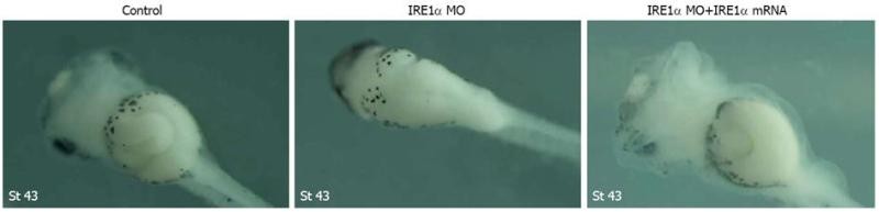Overexpression of inositol-requiring enzyme 1α affected neither mesoderm and endoderm formation nor gut development. A: Overexpression of inositol-requiring enzyme (IRE) 1α did not change the phenotype and the expression of Xbra and Xsox17α at stage 10.5; B: IRE1α mRNA injected embryos at tailbud stage were nearly normal; C: Embryos injected with IRE1α-GR mRNA did not display any defect until tadpole stage.