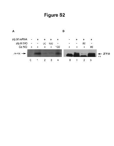 Figure S2. Efficacy of zfp36 mRNA translation inhibition by morpholinos. (A) 500 pg of zfp36 mRNA were in vitro translated in reticulocyte lysate and translation products were analyzed by SDS PAGE followed by autoradiography. Lane 0, mock translation without mRNA; lane 1, no zfp36 MO; lane 2, 50 ng of zfp36 MO; lane 3, 100 ng of zfp36 MO; lane 4, 100 ng of Control (Co) MO. (B) 250 pg of zfp36 mRNA were injected in embryo alone (lane 1) or with 80 ng of zfp36 MO (lane 2) or 80 ng of control MO (lane 3). Embryos were fixed at stage 12 and protein extracts were analyzed by western blot with an anti flag antibody. The migration of zfp36 protein is indicated by an arrow. Lane 0, uninjected embryo. Non specific signal (ns). |