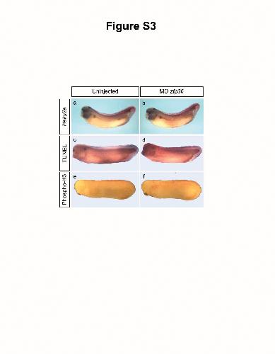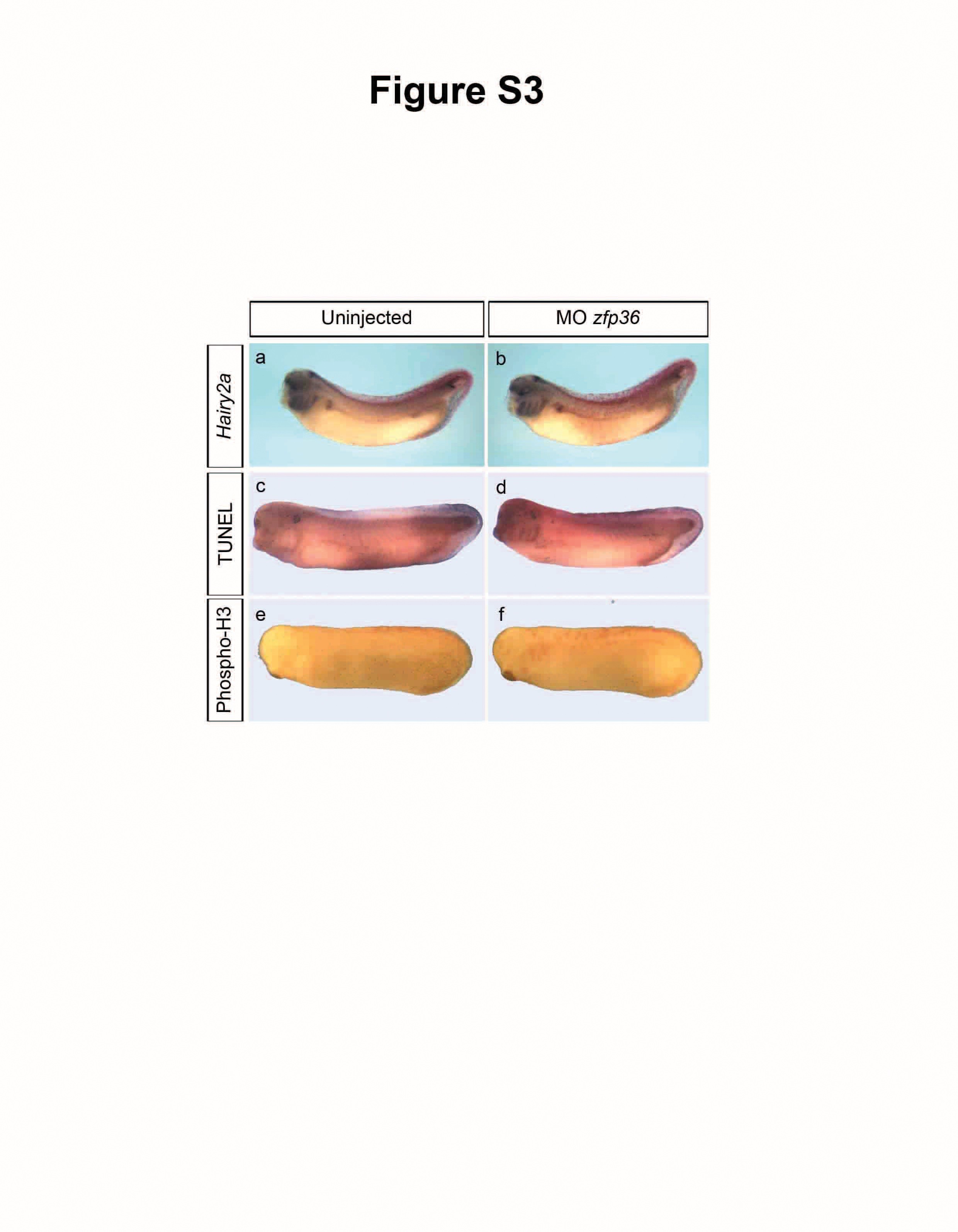 Figure S3. mpaired pronephros morphogenesis caused by zfp36 depletion is largely independent of Notch pathway, proliferation or apoptosis. 8-cell stage embryos were injected unilaterally with 20 ng of zfp36 morpholinos together with 250 pg of lacZ mRNA tracer and analysed at stage 33/34 for Hairy2a expression by whole mount in situ hybridization (a, b), at stage 32 by TUNEL assay (c, d) or at stage 28 by immunohistochemistry with anti-phospho-Histone H3 antibody (Phospho-H3) (e, f). |