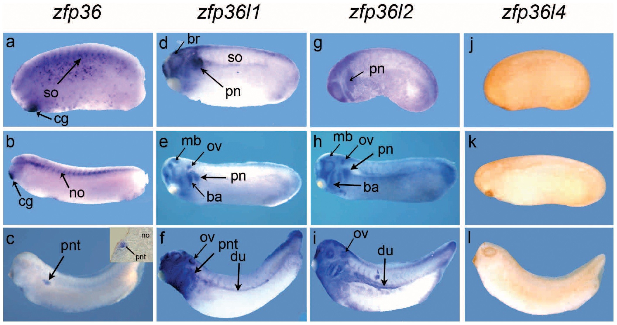 Figure 3. Zfp36 has a distinct spatial expression from zfp36l1 and zfp36l2 in the embryo. The localization of zfp36 mRNAs was detected by in situ hybridization in embryos from stage 24 (a, d, g, j), stage 28 (b, e, h, k) and stage 35/36 (c, f, i, l). A close up view of a transverse section at the level of pronephros is shown in c. Zfp36l4 expression was never detected in the embryos at any stage. ba, branchial arches; br, brain; cg, cement gland; du, pronephric duct; mb, midbrain; no, notochord, ov; otic vesicle; pn, pronephros anlage, pronephric tubule; so, somites. |