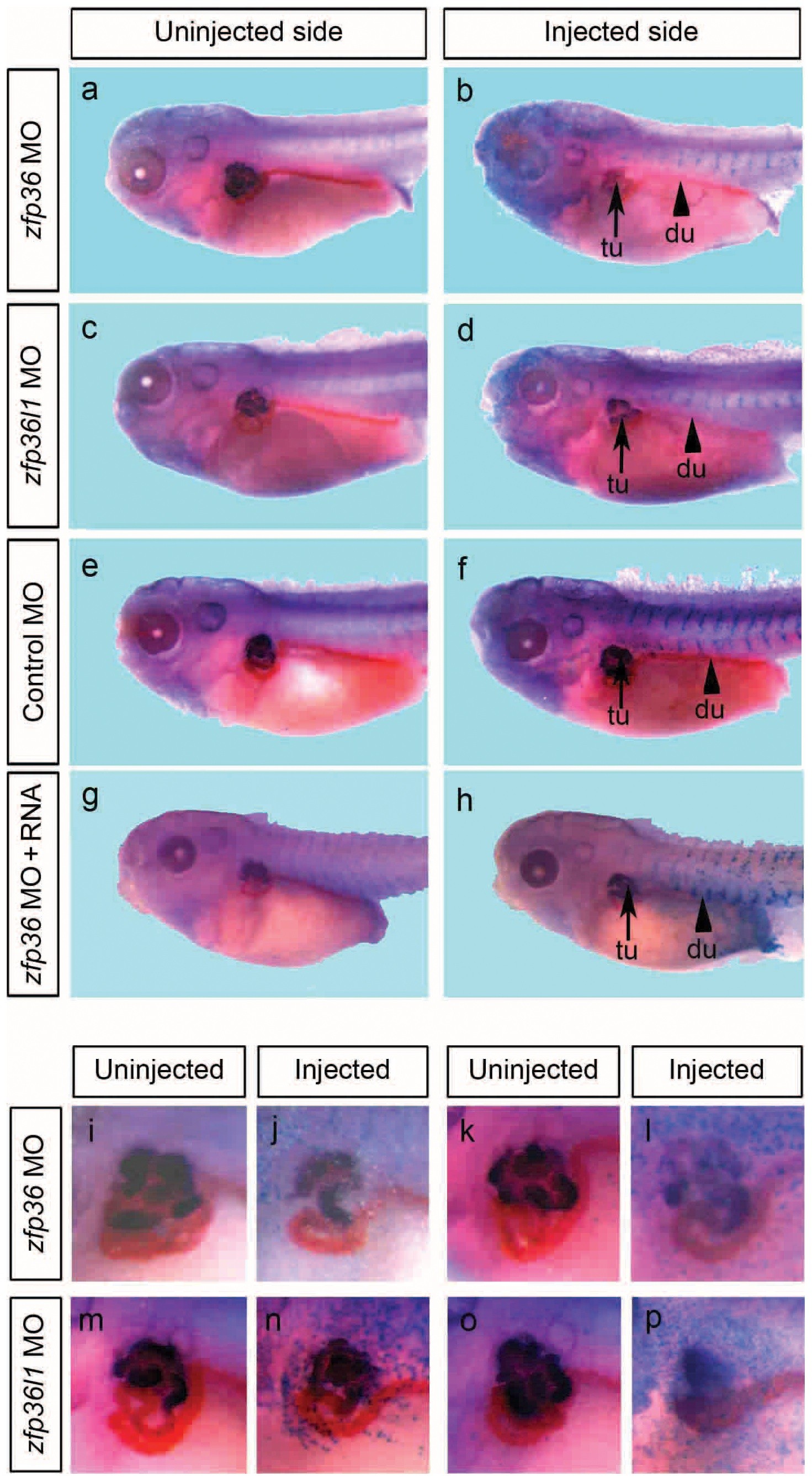 Figure 9. Zfp36 and zfp36l1 morpholino knock down induces pronephros alterations. 20 ng of morpholinos directed against zfp36 (a, b) or zfp36l1 (c, d) mRNAs or control morpholinos (e, f) were injected into one ventral blastomere of 8-cell stage embryos with 250 pg of lacZ mRNA. In rescue experiments, 10000 pg of mouse zfp36 mRNA were co-injected with 20 ng of MO zfp36 (g, h). Developing embryos were fixed at stage 40 before lacZ staining and immunohistochemistry analysis to reveal the expression of pronephros specific markers, 3G8 and 4A6. Arrows and arrowheads in b, d, f and h, mark the pronephros proximal tubule (tu) and duct (du) respectively on injected sides of the embryos. I, Close up views of anterior region showing uninjected or injected sides of representative phenotypes for zfp36 morphants (i) and zfp36l1 morphants (m). |