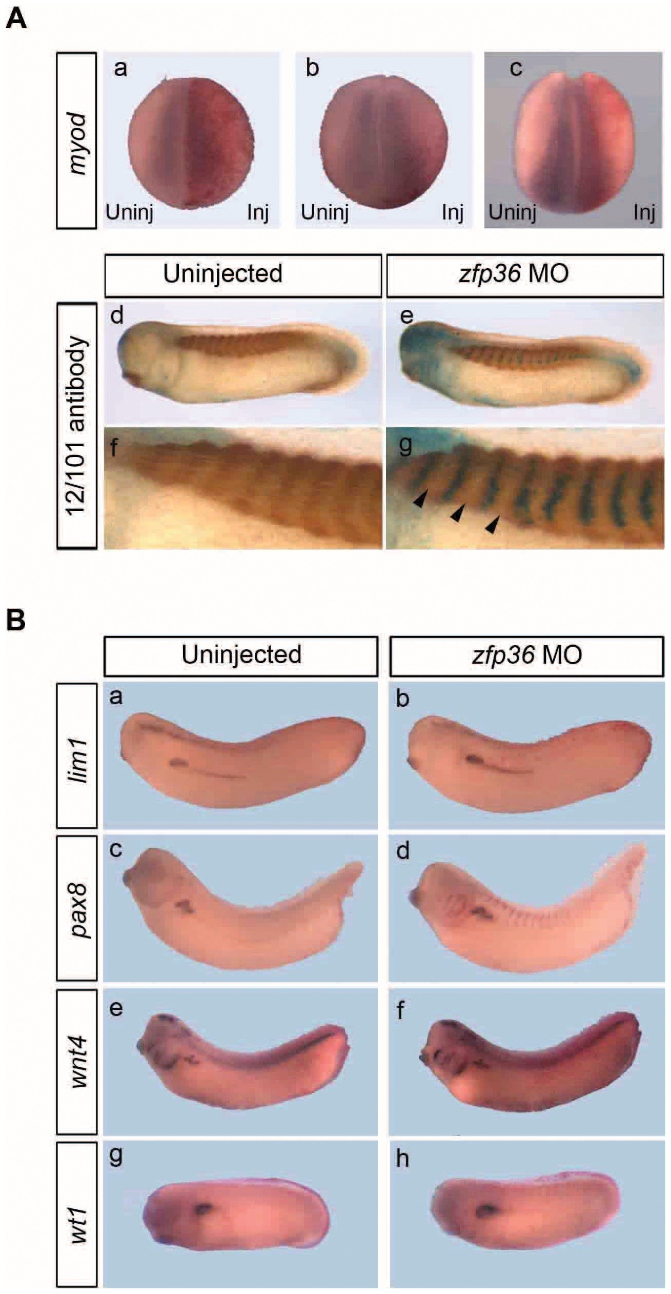 Figure 10. Zfp36 depletion does not affect somitogenesis nor early pronephros specification. (A) 20 ng of zfp36 morpholinos (MO) were injected into one dorsal blastomere of 4-cell stage embryos with 250 pg of lacZ mRNA. Embryos were fixed at stage 15 for the detection of myod by in situ hybridization (a) or at stage 28 for immunohistochemistry with 12/101 antibody (d). a, b and c are representative phenotypes and f and g are close up views of d and e respectively. Arrowheads indicate regularly segmented somites on the injected side. (B) 20 ng of zfp36 morpholinos (MO) were injected into one ventral blastomere of 8-cell stage embryos with 250 pg of lacZ mRNA. Embryos were fixed at stage 29/30 (a, b, e, f), 33/34 (c, d) or 27 (g, h) and analysed for the expression of lim1, pax8, wnt4 and wt1 by in situ hybridization. |