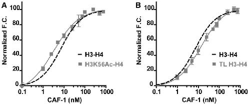 Figure 2. Acetylation of H3K56 increases CAF-1 affinity for H3-H4, whereas removal of the terminal histone tails has no measurable effect. (A) The binding curves for H3K56Ac-H4 (gray squares) and wild-type H3-H4 (dashed line) with increased concentration of CAF-1. CAF-1 binds the acetylated form of H3-H4 with ∼2.5-fold higher affinity than that of the wild-type H3-H4 complex as shown through increased binding (more fluorescence change) at lower CAF-1 concentrations. (B) The effect of the histone tails on CAF-1 binding. H3-H4 complex lacking amino-terminal tails (gray squares) (H3 res. 27-135 and H4 res. 20-102) are titrated with CAF-1 and produce a markedly similar binding curve as the wild-type H3-H4 (dashed line). The error bars represent the standard error within individual data points.The total data points for a single experiment are 48.
