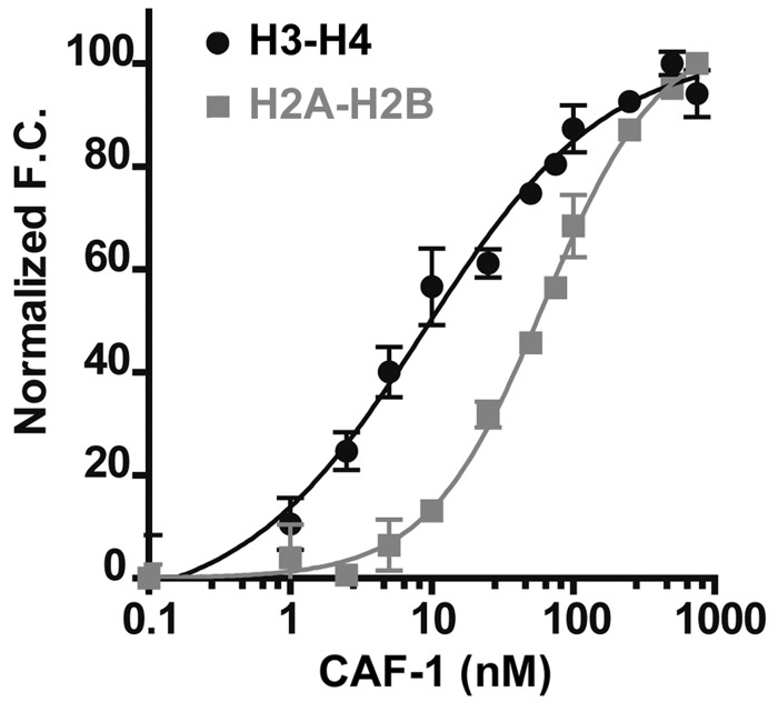 Figure 1. CAF-1 binds H3-H4 with ∼20-fold higher affinity than H2A-H2B. Titration of CAF-1 into fluorescently labeled histone complexes (H3-H4 and H2A-H2B) results in a change in fluorescent signal, indicating direct binding events. The normalized fluorescent change was plotted against increasing CAF-1 concentration (log [CAF-1]) to produce a binding curve where the CAF-1 concentration at 50% fluorescent change equals the apparent dissociation constant (Kdapp) for the CAF-1/histone complex. CAF-1 binds H3-H4 in the low nanomolar range with the averaged data points shown as black circles. The data points were fit with a non-linear regression curve to establish the apparent dissociation constant and Hill coefficient. CAF-1 binds H2A-H2B with significantly lower affinity, which is seen by a rightward shifted binding curve (gray squares). The error bars represent the standard error within individual data points. The total data points for a single experiment are 48.