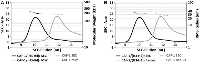 Figure 5. Determination of the apparent molecular weight of CAF-1/H3-H4 complex using SEC-MALS. (A) The elution profiles for CAF-1 (gray) and H3-H4 bound CAF-1 (black). H3-H4 binding by CAF-1 results in earlier elution volumes (10 ml) than CAF-1 alone (12 ml), suggesting a larger molecular weight for the complex. Light scattering confirms a consistently larger molecular weight across the earlier eluting peak (Panel A, right axis and Table 2). (B) The same size exclusion peak profile as (A), but with the measured root mean square (RMS) radius for each peak highlighted on the right axis. The CAF-1/H3-H4 complex has only a slightly larger radius in solution than CAF-1 alone (Table 2).