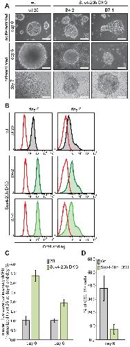 Wild-type and Suv4-20h DKO ES cells were grown undifferentiated in LIF-containing medium, or differentiated in vitro by embryoid body formation. Wt26 - isogenic wild-type ES cell line; B4-2, B7-1 independent Suv4-20h DKO ES cell lines. (A) Morphological appearance (scale bar 100 ). Top row: undifferentiated ES cells (day 0); middle: embryoid bodies at day 6; bottom: cells from embryoid bodies, replated for 24h. (B) Before (day 0) and during (day 6) differentiation, cell lines were stained for Oct4 protein and 204 cells from each condition were subjected to FACS analysis. Red graph: fluorescence of non-specific isotype control; black and green graphs represent the Oct4 protein levels in wild-type and Suv4-20h DKO ES cell lines, respectively. (C) Suv4-20h DKO cells have higher Oct4 protein levels compared to wild-type ES cells and maintain these during differentiation. Median fluorescence intensity was calculated from data in panel (B), error bars indicate SEM. (D) Suv4-20h DKO cells show a reduction in the percentage of CXCR4 + cells at differentiation day 6. Data represent normalized values of percentage of CXCR4+ cells as means of three independent experiments, error bars indicate SEM.