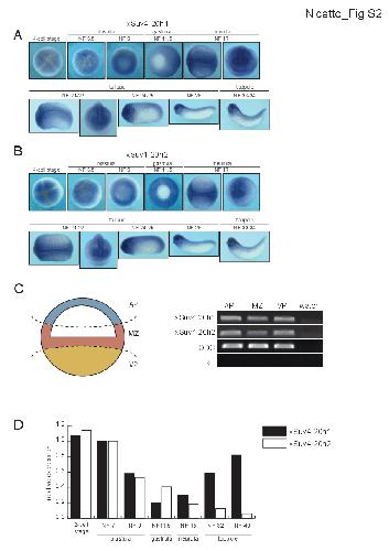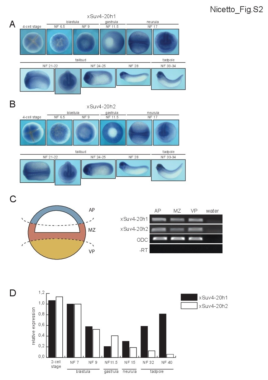 Figure S2. Xenopus laevis Suv4-20h expression during early development. XSuv4-20h1 (A) and xSuv4-20h2 (B) mRNA expression was detected by RNA in situ hybridization at the indicated developmental stages. (C) Total RNA was extracted from animal cap (AC), marginal zone (MZ) and vegetal pole (VP) explants of NF9 embryos; semiquantitative PCR shows relative levels of xSuv4-20h1 and xSuv4-20h2 transcripts in the three explants. ODC was used as loading control, -RT as negative control. (D) qRT-PCR profiles of xSuv4-20h enzymes. The chart shows the expression of the two enzymes relative to ODC at the indicated developmental stages. |