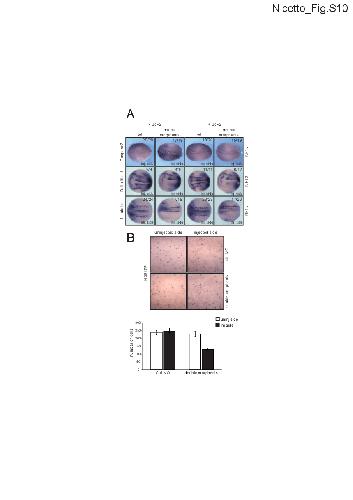 Figure S10. Cell proliferation and apoptosis in xSuv4-20h double morphants. (A) Double morphants show increased number of apoptotic cells during neurulation. Top row immunocytochemistry for active Caspase3 in unilaterally injected embryos (NF15). Middle and bottom rows - RNA in situ hybridisation for Delta-like 1 (NF13) and N-tubulin mRNAs (NF15). Pictures show dorsal views, with anterior to the left. (B) Proliferation assay immunocytochemistry for the mitotic histone modification H3S10P in Crtl-MO versus double morphant embryos. The chart shows a two-fold difference in the number of H3S10P positive cells on the injected side of double morphants. Data represent mean values of four embryos per condition from two independent experiments; error bars indicate SEM. |