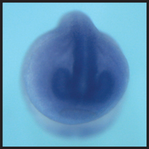 kmt5c (lysine (K)-specific methyltransferase 5C) gene expression in Xenopus laevis embryo, assayed via in situ hybridization, NF stage 17, anterior view, dorsal up. |