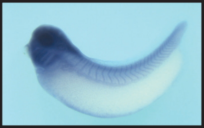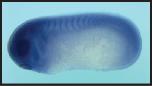 kmt5c (lysine (K)-specific methyltransferase 5C) gene expression in Xenopus laevis embryo, assayed via in situ hybridization, NF stage 33-34, lateral view, anterior left, dorsal up. |
