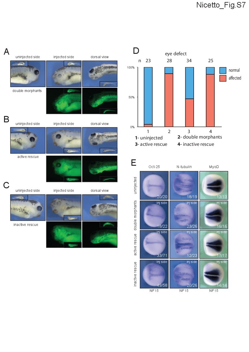 Figure S7. A functional SET domain is required for morphological and molecular rescue of double-morphants phenotypes. (A) Morphological phenotypes of NF30-33 double morphants (A), embryos injected with xSuv4-20h1, h2 morpholinos and active (active rescue, B), or inactive (inactive rescue, C) mouse Suv4-20h1, h2 mRNAs. Embryos were coinjected in one half at two cell stage with Alexa Fluor 488 Dextran as lineage tracer (green channel) to identify the injected side and sort embryos. (D) Penetrance of the eye phenotype in the indicated samples. Displayed are the results from two independent experiments. (E) RNA In situ hybridization analysis of NF15 uninjected, double morphants, active and inactive rescue embryos using probes against Oct-25, N-tubulin and MyoD. The pictures show dorsal view of stained embryos, anterior is on the left. |