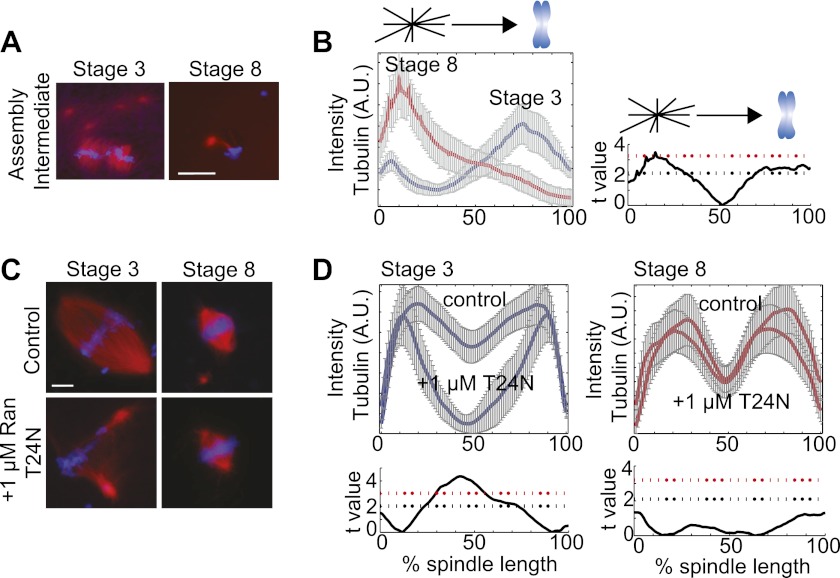 Figure 2. Spindle assembly pathways change during development.(A) Spindle assembly intermediates 15 min after initiation exhibit different morphologies in stage 3 and stage 8 extracts. (B) Left panel: Line scan quantification of tubulin intensity in spindle intermediates starting at the centrosome and ending at chromatin with normalized lengths for statistical analysis. Right panel: t-test statistical analysis across discrete length bins of stage 3 and stage 8 intensities as described in the experimental procedures. Black dashed line is equivalent to a p value of 0.01 and red dashed line is equivalent to a p value of 0.001. (C) Inhibition of the RanGTP gradient by addition of 1 µM RanT24N disrupts steady-state spindles in stage 3 but not stage 8 extracts. (D) Upper panels: Line scan quantification of tubulin intensity with normalized spindle lengths for statistical analysis. Lower panels: t-test statistical analysis across discrete length bins of control vs 1 µM RanT24N addition as described in the experimental procedures. Black dashed line is equivalent to a p value of 0.01 and red dashed line is equivalent to a p value of 0.001. Mean ± SE from three extracts, tubulin is red and DNA is blue. The scale bars represent 10 µm.DOI: http://dx.doi.org/10.7554/eLife.00290.005 |