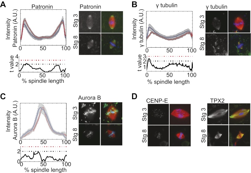 Figure 3—figure supplement 1. Fluorescence intensity analysis of MT dynamics modulators.(A), (B), and (C) Upper panels: Line scan quantification of patronin (A), gamma tubulin (B), and aurora B (C) fluorescence intensity with normalized spindle lengths for statistical analysis, blue line is stage 3 and red line is stage 8. Lower panels: t-test statistical analysis across discrete length bins as described in the experimental procedures. These modulators of MT dynamics show little to no difference in intensities. Black dashed line is equivalent to a p value of 0.01 and red dashed line is equivalent to a p value of 0.001. Mean ± SE from three extracts. (D) Immunofluorescence localization of CENP-E and TPX2 appear similar in stage 3 and stage 8 embryo extract spindles.DOI: http://dx.doi.org/10.7554/eLife.00290.010 |