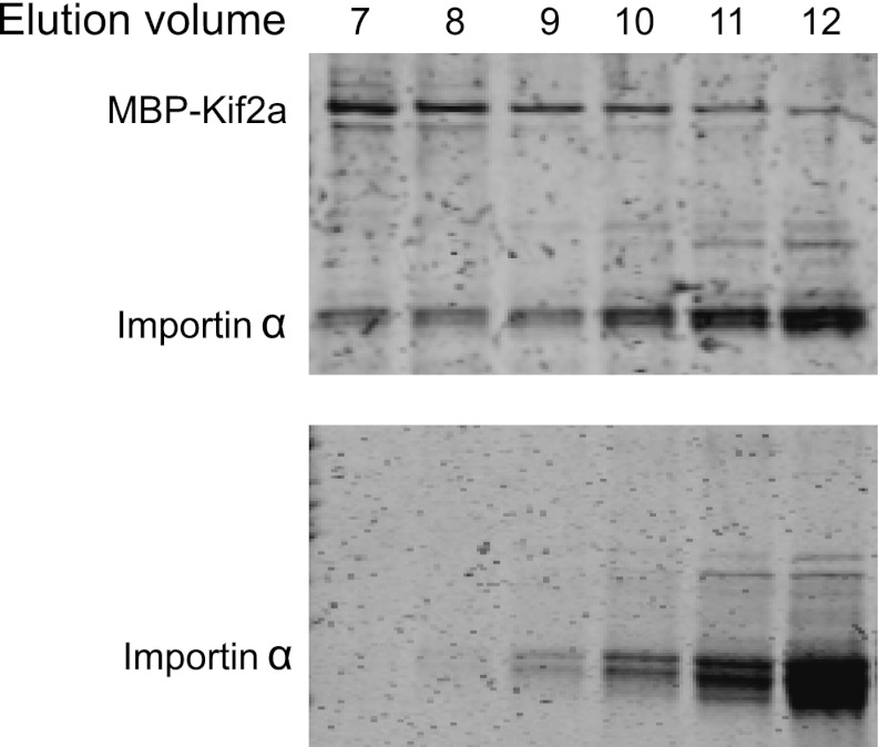 Figure 4—figure supplement 2. Kif2a interacts with importin size exclusion chromatography of kif2a and importin α or importin α alone on a superdex 200 column.In the presence of kif2a, a portion of importin α elutes earlier and together with kif2a.DOI: http://dx.doi.org/10.7554/eLife.00290.013 |