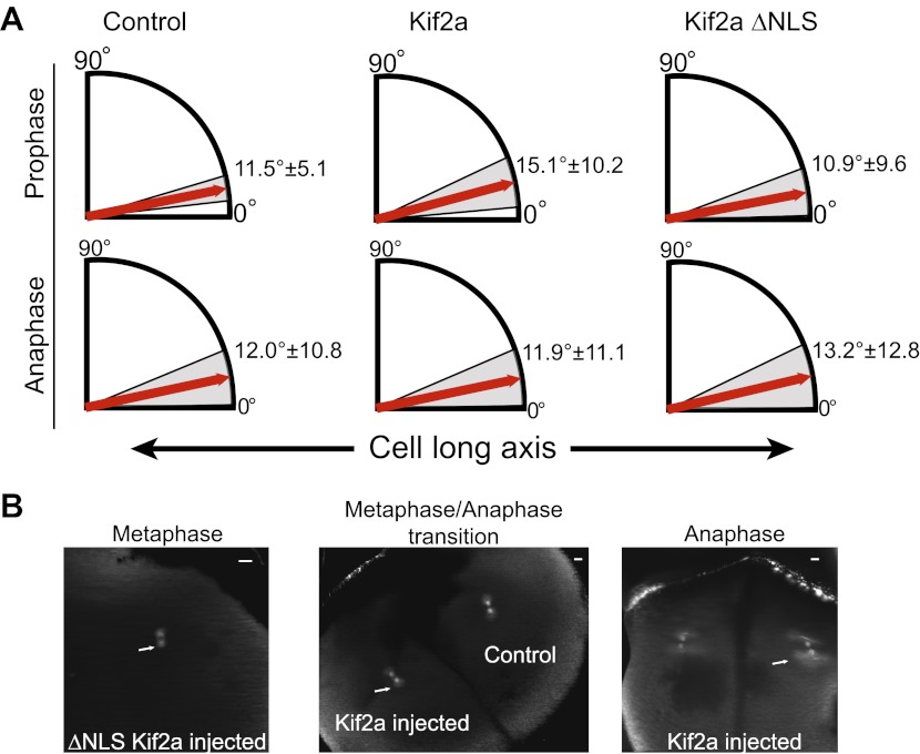 Figure 7. Metaphase spindle orientation in stage 3 embryos depends on spindle size.(A) Microinjection of kif2a into two-cell embryos just prior to cytokinesis decreases spindle size in the subsequent mitosis. Representative images of decreased spindle size in fixed hemisected embryos. Spindle orientation (pole-to-pole axis, red arrow, vs long axis of the cells, white arrow) is indicated in bottom left. The scale bar represents 40 µm. (B) Quantification of spindle orientation in stage 3 embryos after microinjection of kif2a or kif2a ΔNLS at metaphase. Only metaphase spindle orientation is affected. Mean ± SD, n = 6–15 spindles, p<0.01 by unpaired t-test for control vs kif2a injected and p<0.0001 for control vs kif2a ΔNLS injected. (C) Correlation plot of spindle length and spindle orientation in stage 3 embryos. Each point is a single spindle, and the line a linear regression of all the data. (D) Model of how kif2a regulation by importin α regulates spindle size during development.DOI: http://dx.doi.org/10.7554/eLife.00290.019Figure 7—figure supplement 1. Prophase and anaphase spindle orientation and astral MTs.(A) Quantification of spindle orientation in stage 3 embryos after microinjection of kif2a or kif2a ΔNLS at prophase and anaphase. Mean ± SD, n = 8–15 spindles. Comparison between control and either kif2a or kif2a ΔNLS was not significant by unpaired t-test in either prophase or anaphase. (B) Examples of spindles with astral MTs at different stages of mitosis found in stage 3 embryos microinjected with 100 nM kif2a or kif2a ΔNLS as detected by immunofluorescence against α-tubulin.DOI: http://dx.doi.org/10.7554/eLife.00290.020 |