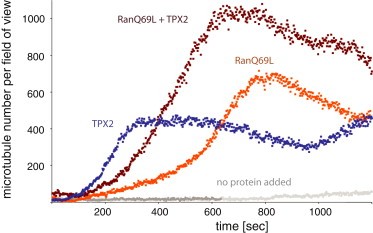 Figure 2. Quantifying the Effect of RanQ69L and TPX2 on Microtubule NucleationThe number of GFP-EB1 spots is counted for each time frame and experimental condition and plotted against time. Because each microtubule, even when branched, is marked by a single EB1 spot at its growing plus tip, counting the number of EB1 spots directly corresponds to the number of microtubules per frame and field of view (82.2 à 82.2 μm). Data are from a control extract in which only vanadate was added or experiments in which further additions of RanQ69L, TPX2, or RanQ69L plus TPX2 were made. |