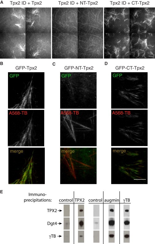 Figure 5. Rescue of Branching Microtubule Nucleation by Addition of Recombinant TPX2 to TPX2-Depleted Xenopus Extracts(A) Addition of purified TPX2 or CT-TPX2 to an extract depleted of TPX2 (see Figure 3D) could rescue branching microtubule nucleation and the formation of branched fan-like structures. In contrast, add-back of NT-TPX2 displayed the same phenotype as TPX2 immunodepletion (see Figure 3D). For each experimental condition a montage of four adjacent fields is displayed, which was collected with the slide explorer function of the MicroManager software (Edelstein et al., 2010). Scale bar, 10 μm. See also Movie S7.(BâD) Localization of full-length GFP-TPX2 (B), the N terminus of GFP-TPX2 (GFP-NT-TPX2) (C), and the C terminus of GFP-TPX2 (GFP-CT-TPX2) (D). The full-length and GFP-CT-TPX2 constructs bind along microtubules (A568-TB) of the fan-like structures, whereas the N terminus of GFP-TPX2 can hardly be detected. Scale bar, 10 μm.(E) Immunoprecipitations using antibodies specific against TPX2, augmin, and γ-TB, and control antibodies (total-IgG-fraction antibodies). The same antibodies were used in the immunoblot as detection reagents. TPX2, augmin, and γ-TB interact with each other. The two controls reflect separate immunoprecipitation experiments. |
