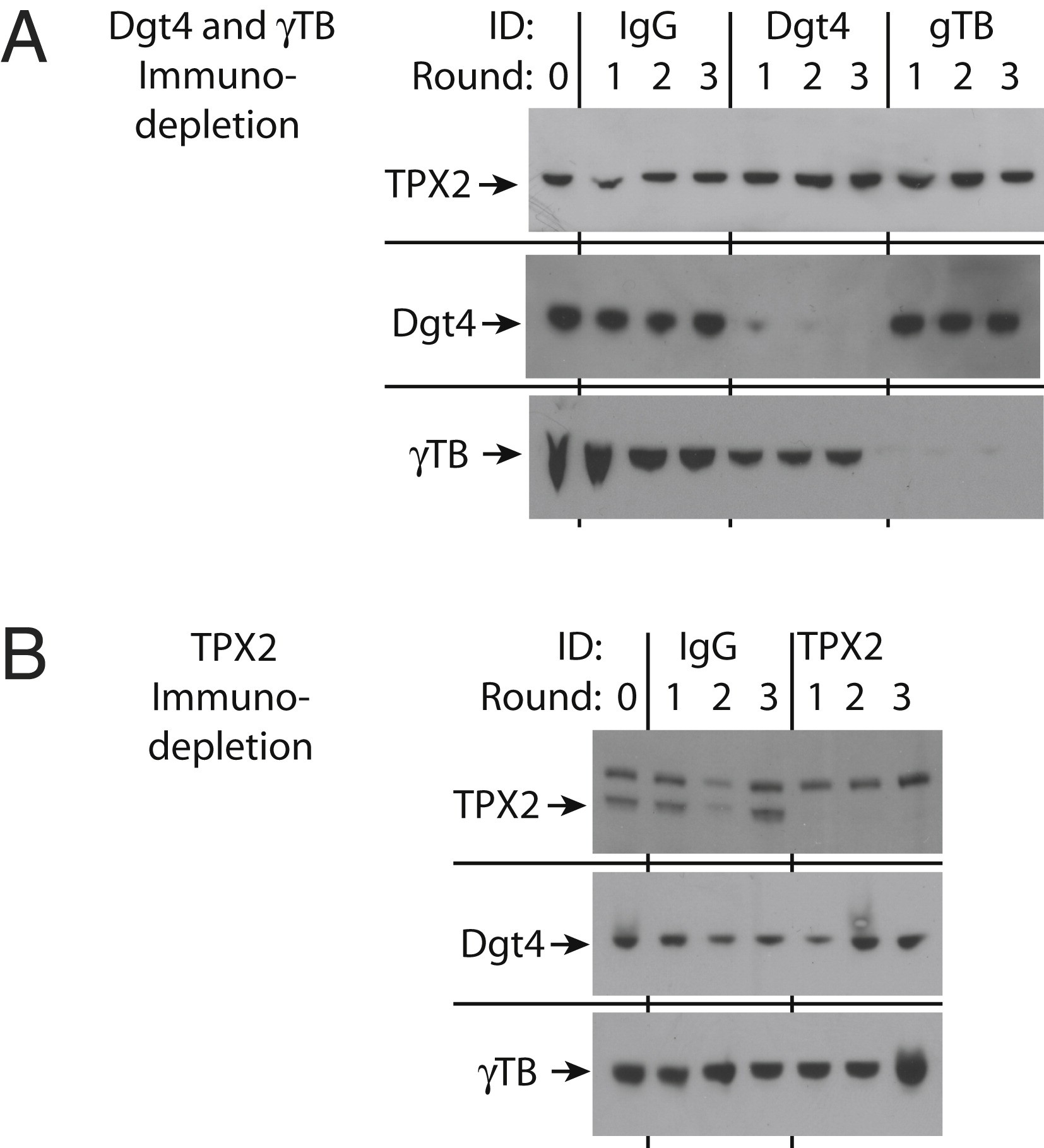 Figure S2. Immunodepletions of TPX2, Augmin and γ-TB from Xenopus Egg Extract, Related to Figure 4(A) Immunoblot of immunodepletion of total IgG-fraction antibodies as a control and TPX2.(B) Immunoblot of immunodepletion of augmin, γ-TB, and total IgG-fraction antibodies. |