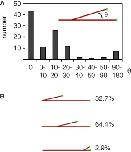 Figure 3. Properties of Branching Microtubule Nucleation in a RanQ69L-Treated Extract(A) Quantification of branch angles between the mother microtubule and the newly growing daughter microtubule. A 0° angle corresponds to growth of a new microtubule parallel to the mother microtubule, whereas a 180° angle signifies antiparallel growth. The polarity of the mother microtubule is preserved if the branch angle is smaller than 90°. Eighty-nine percent of the branches are <30°.(B) Quantification of branch position along the template microtubule. The majority of branches occur along the middle of the microtubule, about a third originate at the microtubule minus end, and more rarely, the EB1-enriched microtubule plus tip branches. |