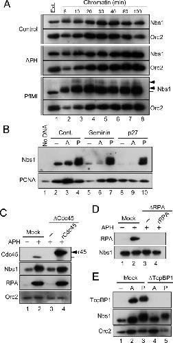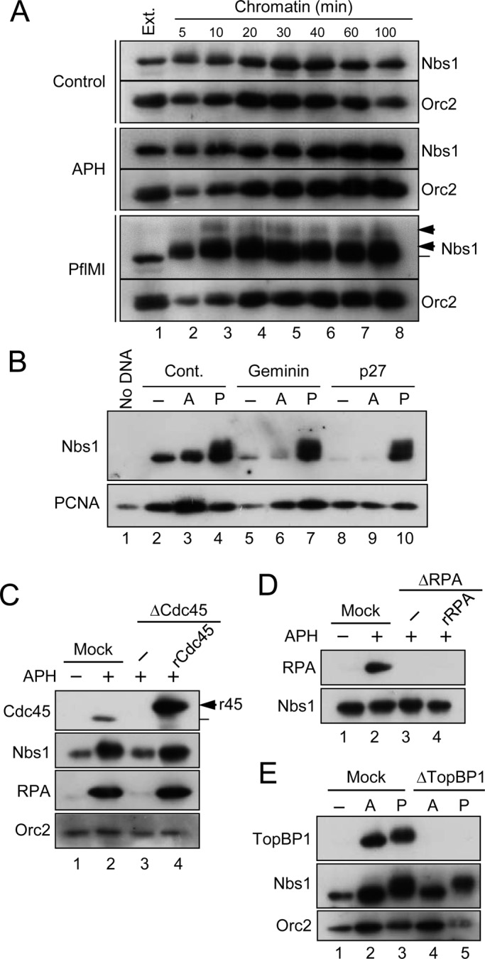 FIGURE 2:. The MRN complex associates with chromatin in a replication-dependent manner. (A) Time course for binding of Nbs1 to chromatin. Interphase egg extracts treated with control buffer (top), APH (middle), or PflMI (bottom) were incubated with sperm chromatin (lanes 2â8). Chromatin fractions were prepared at the indicated times for immunoblotting with anti-Nbs1 and anti-Orc2 antibodies. Lane 1 depicts 1 μl of egg extract. (B) Extracts incubated with no checkpoint inducer (lanes 2, 5, and 8), APH (A; lanes 3, 6, and 9), or PflMI (P; lanes 4, 7, and 10) were treated with control buffer (lanes 2â4), Geminin (lanes 5â7), or p27 (lanes 8â10). Chromatin fractions were prepared and immunoblotted for Nbs1 (top) and PCNA (bottom). The sample for lane 1 lacked any added sperm chromatin. (C) Chromatin fractions were prepared from mock-treated (lanes 1 and 2) or Cdc45-depleted (lanes 3 and 4) extracts that had been incubated in the absence (lane 1) or presence (lanes 2â4) of APH. Recombinant Xenopus Cdc45 (r45) was added back in lane 4 (arrow). Samples were immunoblotted for the indicated proteins. (D) Chromatin fractions were prepared from mock-treated (lanes 1 and 2) or RPA-depleted (lanes 3 and 4) extracts that had been incubated in the absence (lane 1) or presence (lanes 2â4) of APH. Recombinant human RPA (rRPA) was added to the extract in lane 4. Samples were immunoblotted with antibodies against Xenopus Nbs1 and RPA70. Note that human RPA70 does not cross-react with the anti-Xenopus antibodies. (E) Chromatin fractions were prepared from mock-treated (lanes 1â3) or TopBP1-depleted (lanes 4â5) extracts that had been incubated in the absence (lane 1) or presence of either APH (A; lanes 2 and 4) or PflMI (P; lanes 3 and 5). Fractions were immunoblotted for the indicated proteins. |