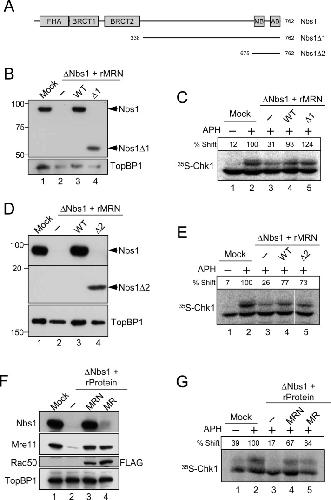 FIGURE 4:. The Nbs1 component of the MRN complex is dispensable for the APH-induced activation of Chk1. (A) Domains of the Xenopus Nbs1 protein. The protein contains an FHA domain and two BRCT domains in its N-terminal region and an Mre11-binding domain (MB) and ATM-binding domain (AB) in its C-terminal region. Two deletion constructs of Nbs1 (∆1 and ∆2) are depicted. (B and D) Egg extracts were mock-treated with control antibodies (lane 1) or immunodepleted with anti-Nbs1 antibodies (lanes 2–4). Extracts were supplemented with control buffer (B and D, lanes 1 and 2), wild-type rMRN complex (B and D, lane 3), mutant rMRN∆1 complex (B, lane 4), or mutant rMRN∆2 complex (D, lane 4). Extracts were immunoblotted with anti-Nbs1 and anti-TopBP1 antibodies. (C and E) Extracts from (B) and (D), respectively, were incubated with [35S]Chk1 in the absence (lane 1) or presence (lanes 2–5) of APH. Nuclear fractions from the extracts were processed for phosphorimaging to assess phosphorylation-dependent shifting of Chk1. Numbers above each lane denote quantitation of phosphorylation relative to mock-depleted, APH-treated extracts. (F) Mock-treated (lane 1) or Nbs1-depleted extracts (lanes 2–4) were supplemented with control buffer (lanes 1 and 2), wild-type rMRN complex (lane 3), or recombinant MR complex lacking Nbs1 (lane 4). For these experiments, the Rad50 subunit in the trimeric MRN and dimeric MR complexes contained a C-terminal FLAG tag (see Materials and Methods). Extracts were immunoblotted for the indicated proteins. (G) Extracts in (F) were incubated with [35S]Chk1 in the absence (lane 1) or presence (lanes 2–5) of APH. Nuclear fractions from the extracts were processed for phosphorimaging. |