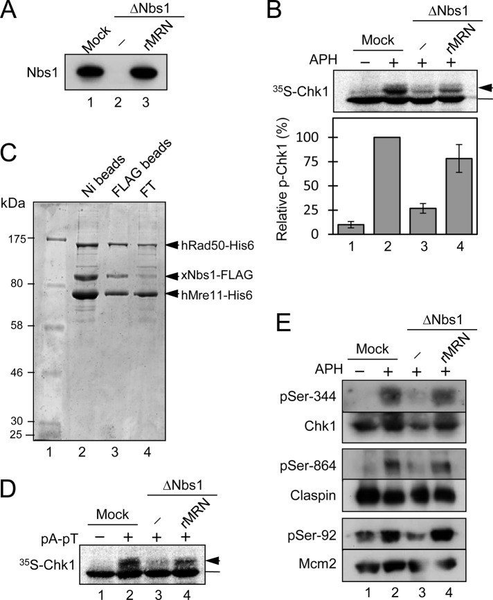 FIGURE 1:. The MRN complex is involved in the pathway that activates Chk1 in response to DNA replication blockages in Xenopus egg extracts. (A) Interphase egg extracts were subjected to an immunodepletion procedure with beads containing control antibodies (lane 1) or anti-Nbs1 antibodies (lanes 2 and 3). rMRN, prepared as described in (C), was added back to a level close to the endogenous amount (lane 3). Samples were immunoblotted for Nbs1. (B) Egg extracts from (A) were incubated with sperm chromatin and [35S]Chk1 in the absence (lane 1) or presence (lanes 2–4) of APH. Nuclear fractions from the extracts were processed for SDS–PAGE and phosphorimaging to assess phosphorylation of Chk1. Unshifted Chk1 was marked with a bar and slower-migrating band(s) with an arrow. Phosphorylation was expressed as a percentage of the level in mock-depleted extracts (lane 2). Results (mean ± SD) are from three independent experiments. (C) Expression and purification of rMRN from insect cells. Sf9 insect cells were coinfected with recombinant baculoviruses encoding human Mre11 (hMre11-His6), human Rad50 (hRad50-His6), and Xenopus Nbs1 (xNbs1-FLAG). Cell lysates were incubated with nickel (Ni) agarose, and bound proteins were eluted with imidazole buffer (lane 2). Next, this eluate was incubated with anti-FLAG antibody beads to achieve further purification. The flow-through fraction (FT) from this step is shown in lane 4. Finally, the bead-bound proteins were eluted with FLAG peptide (lane 3). Lane 1 contains molecular size markers. Samples were separated by SDS–PAGE and stained with Coomassie Brilliant Blue. (D) Egg extracts from (A) were incubated in the absence (lane 1) or presence (lanes 2–4) of pA-pT. [35S]-labeled Chk1 protein was included in extracts in order to monitor checkpoint activation. Samples were analyzed by SDS–PAGE and phosphorimaging. (E) Samples prepared as in (B) were analyzed for the phosphorylation status of various endogenous proteins by immunoblotting with antibodies that detect Ser-344 of Chk1, Ser-864 of Claspin, and Ser-92 of Mcm2. Samples were also immunoblotted for the corresponding protein antigens. |