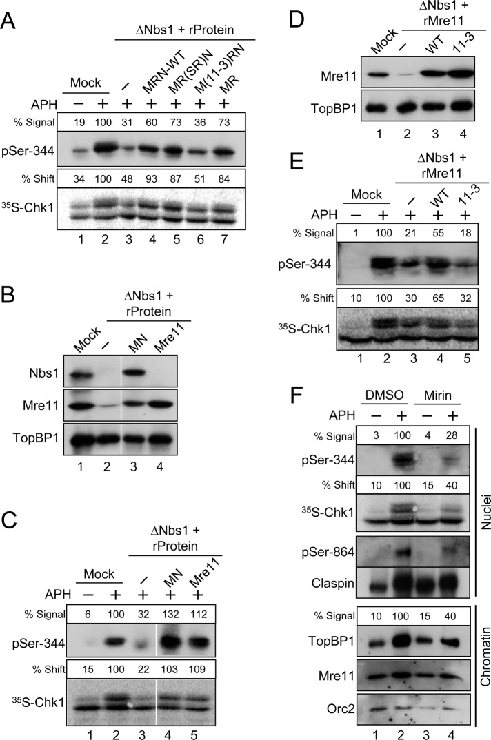 FIGURE 5:. Mre11 is essential for the DNA replication checkpoint in egg extracts. (A) Mock-depleted (lanes 1 and 2) or Nbs1-depleted (lanes 3–7) extracts were supplemented with the following: control buffer (lanes 1–3), recombinant MRN complexes containing all wild-type subunits (lane 4), a Rad50-SR mutant subunit (lane 5), or an Mre11-3 mutant subunit (lane 6), and dimeric MR complex (lane 7). Extracts were incubated with [35S]Chk1 in the absence (lane 1) or presence (lanes 2–7) of APH. Nuclear fractions from the extracts were processed for immunoblotting with anti–pSer-344 Chk1 antibodies (top) or for phosphorimaging to detect radiolabeled Chk1 (bottom). Numbers above each lane denote quantitation of phosphorylation relative to mock-depleted, APH-treated extracts. (B) Mock-treated (lane 1) or Nbs1-depleted extracts (lanes 2–4) were supplemented with control buffer (lanes 1 and 2), recombinant Mre11-Nbs1 complex (MN, lane 3) or recombinant Mre11 protein (lane 4). Extracts were immunoblotted for the indicated proteins. (C) Extracts from (B) were incubated with [35S]Chk1 in the absence (lane 1) or presence (lanes 2–5) of APH. Nuclear fractions from the extracts were processed for immunoblotting with anti–pSer-344 Chk1 antibodies (top) or for phosphorimaging to detect radiolabeled Chk1 (bottom). (D) Mock-treated (lane 1) or Nbs1-depleted (lanes 2–4) extracts were supplemented with control buffer (lanes 1 and 2), recombinant wild-type Mre11 protein (lane 3), or the mutant Mre11-3 protein (lane 4). Extracts were immunoblotted for the indicated proteins. (E) Extracts from (D) were incubated with [35S]Chk1 in the absence (lane 1) or presence (lanes 2–5) of APH. Nuclear fractions from the extracts were processed for immunoblotting with anti–pSer-344 Chk1 antibodies (top) or for phosphorimaging to detect radiolabeled Chk1 (bottom). (F) Effects of mirin on the DNA replication checkpoint. Egg extracts were preincubated for 20 min in the absence (lanes 1 and 2) or presence (lanes 3 and 4) of 0.8 mM mirin. At this point, extracts were supplemented with sperm chromatin and [35S]Chk1 and incubated in the absence (lanes 1 and 3) or presence (lanes 2 and 4) of APH. Nuclear fractions (top four panels) were prepared and processed for phosphorimaging and immunoblotting with the indicated antibodies. Numbers above the lanes containing Chk1 denote phosphorylation relative to APH-containing extracts treated with DMSO. Chromatin fractions (bottom three panels) were prepared and immunoblotted for TopBP1, Mre11, and Orc2. The numbers above the lanes containing TopBP1 represent the binding of TopBP1 to chromatin relative to APH-containing extracts treated with DMSO. |