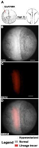 Fig. S2. Hyperpolarization is detected by the voltage sensitive dye CC2-DMPE. (A) Schematic of forcing hyperpolarization by a constitutively open Cl- channel: embryos were co-injected with GlyRF99A mRNA and dextran-conjugated Alexa Fluor 555 (lineage dye) into 1 cell of a 2-cell embryo, allowing the uninjected side to serve as an internal control. Embryos were raised to stage 18 in a high (70 mM) Cl- medium. (B) At stage 18, embryos were soaked in 5 μM CC2 dye in 0.1x MMR, and imaged using a CC2 filter set (EX 405/20; BS 425; EM 460/50). The injected left half of the embryo was highly fluorescent, indicating relative hyperpolarization compared to the right half of the embryo. (C) Imaging of the same embryo using a TRITC filter set confirmed the presence of injected mRNA mix, evidenced by the red fluorescent signal of the lineage tracer. (D) Overlay of CC2 and TRITC images showing the co-localization of hyperpolarization signal and hyperpolarizing channel mRNA. |