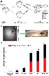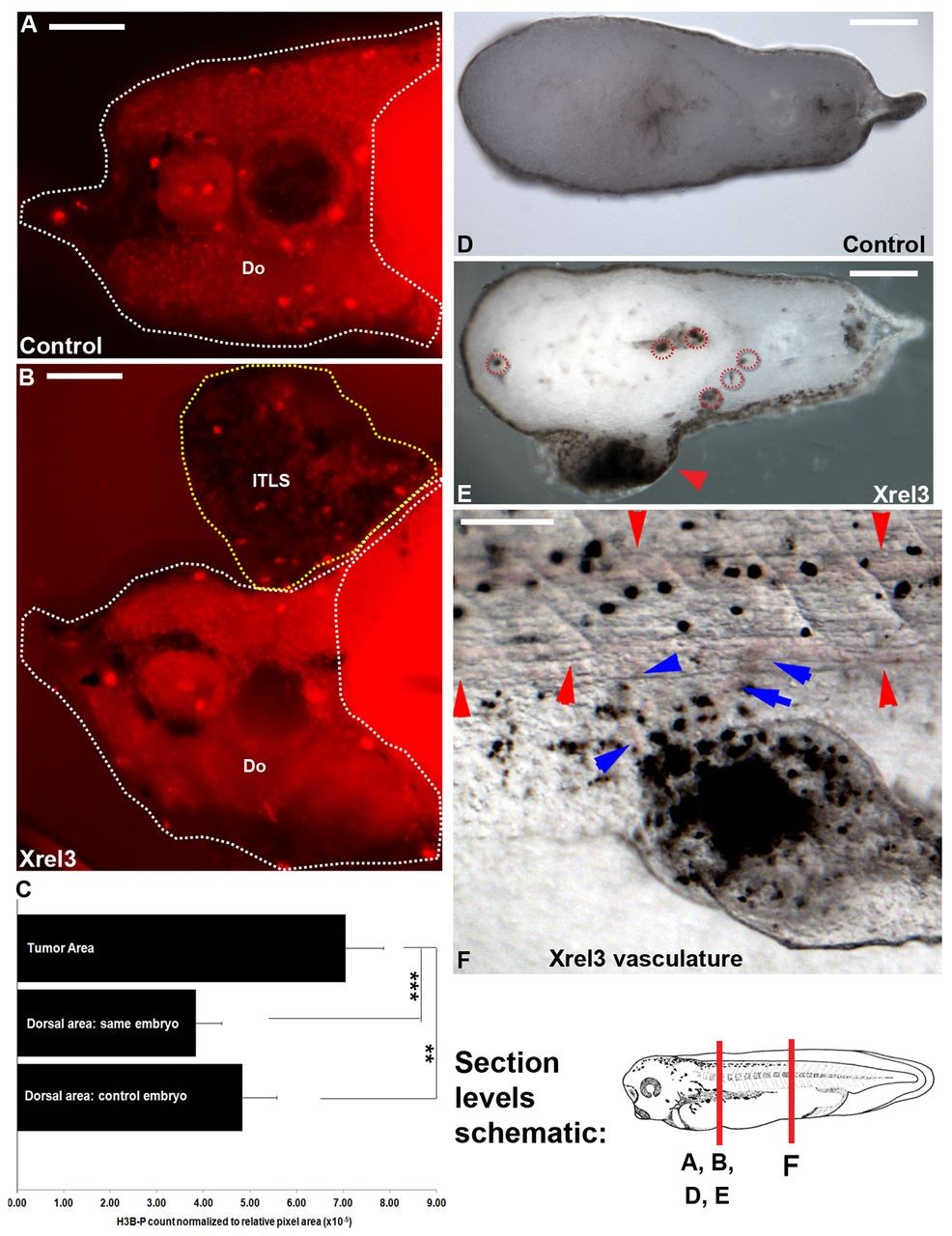 Fig. 2. Induced foci exhibit hallmark characteristics of tumors. (A,B) To analyze proliferation in ITLS regions, embryos were fixed, embedded in agarose, sectioned (as shown in the schematic), and processed for immunohistochemistry with anti-H3B-P antibody: (A) Control section and (B) section through ITLS showing signals of H3B-P-positive cells. The regions traced in white dashes and denoted by ois a region dorsal to the gut; the region traced in yellow dashes is an ITLS region. (C) Quantification of H3B-P signals per pixel area showed significantly higher numbers of proliferative cells in ITLS regions than in dorsal-to-the-gut regions of the same sections or control embryo sections (n=9); **P<0.01, ***P<0.001 (one-way ANOVA, Bonferroni post hoc analysis). (D) Unperturbed embryo sectioned through the red axis (see schematic); (E) Xrel3-induced ITLS sectioned through the same axis. High-magnification analysis reveals that ITLS (red arrowheads) induced by our method can affect not only the epidermis but can also form in internal tissues of the animal (red circular traces). (F) Xrel3-induced ITLS in the tail region showing the ability to attract vasculature (blue arrowheads), as would most real tumors. Red arrowheads represent normal tail vasculature. Scale bars: 100 μm (A,B,D,E); 500 μm (F). |