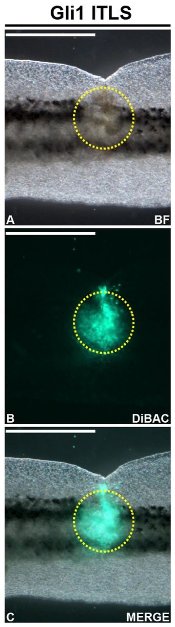 Fig. 3. ITLSs exhibit depolarized Vmem. (A) Brightfield image of a Gli1-induced ITLS (outlined in yellow dashes) on the tail of a stage 40 embryo. (B) Depolarization of ITLSs regions was observed when the same embryo was imaged in DiBAC4(3), a fluorescent reporter of Vmem, using the FITC filter set of a fluorescent microscope. (C) Overlay of brightfield and DiBAC4(3) images showing a depolarized Vmem signature exclusive to the ITLS region. Scale bars: 1 mm. |