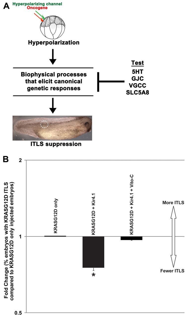 Fig. 6. Suppression screen is employed to probe biophysical mechanisms that transduce Vmem changes into transcriptional responses. (A) Hyperpolarization can be transduced into transcriptional events and cell behavior changes by processes including calcium signaling via voltage-gated Ca2+ channels, Vmem-dependent transport of signaling molecules (e.g. serotonin), electrophoresis of morphogens through gap junctions and Vmem-guided movement of butyrate (tumor suppressor) via SLC5A8 (Levin, 2007; Levin, 2012a). 5HT, serotonin; GJC, gap junction; VGGC, voltage-gated calcium channels; SLC5A8, sodium/butyrate exchanger. To identify a biophysical transduction mechanism responsible for hyperpolarization-mediated tumor suppression, these processes were independently blocked in the ion channel ITLS suppression assay using pharmacological or molecular reagents: 10 μM fluoxetine, which blocks the voltage-gated serotonin transporter SERT; 1.7 mM lindane, which blocks GJC; 0.1 mM cadmium chloride; and 1 ng Vito-C mRNA injection, which inactivates native SLC5A8 transporters. (B) Fold change in the number of embryos with ITLSs: the number of embryos injected only with KrasG12D that exhibited ITLSs was normalized to 1. The embryos co-injected with Kir4.1 show a 1.3-fold decrease in the number of embryos with ITLS (one sample t-test, *P<0.01 compared with a normalized value of 1 that represents ITLS incidence in KrasG12D-only injected embryos). The observed significant decrease (ITLS suppression) was blocked only when Vito-C was injected together with KrasG12D and Kir4.1, implicating native SLC5A8 transporters in Vmem-mediated suppression of ITLS. |