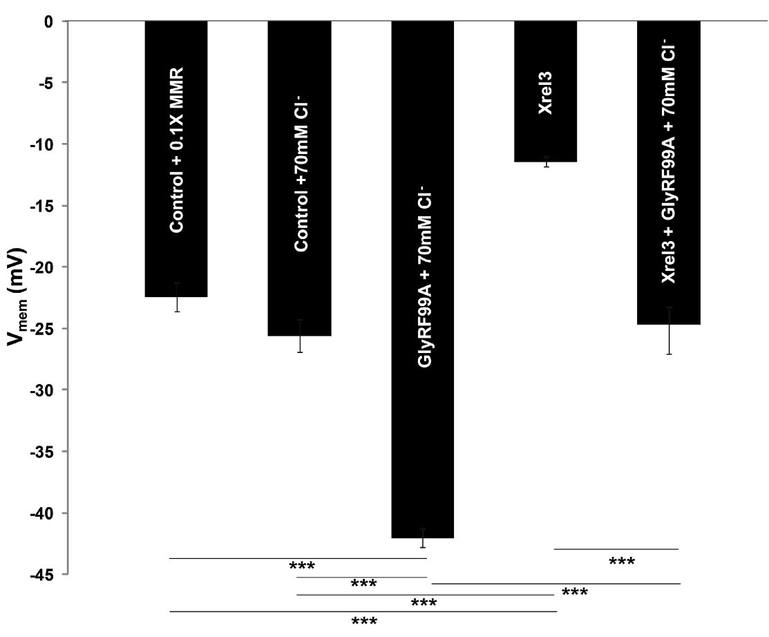 Fig. S1. Vmem changes quantified via electrophysiology. Fertilized 1-cell stage embryos were divided into five treatment categories: uninjected controls in 0.1x MMR, uninjected controls in high Cl-, GlyRF99A injected embryos in high Cl-, Xrel3 injected embryos, and Xrel3 and GlyRF99A co-injected embryos in high Cl-. Standard electrophysiology was used to measure Vmem from embryos in each category: uninjected control group in 0.1x MMR averaged −22.6 mV (n=5), uninjected controls in high Cl- averaged −25.6 mV (n=5), and GlyRF99A injected embryos, when compared to the two control groups, showed a significantly hyperpolarized Vmem (−42.06 mV; n=5). Consistent with data obtained via voltage-sensitive dye imaging, Xrel3-injected embryos are significantly depolarized (average of −11.4 mV; n=5) compared to controls, while co injecting the GlyRF99A channel together with Xrel3 significantly counteracts the depolarization (average of −24.7 mV; n=12). (One-way ANOVA with Bonferroni post hoc analysis, ***P<0.001). |